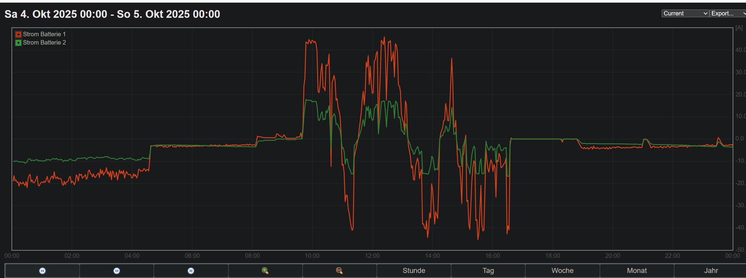 Dieter D. schrieb: > Es bringt nichts, weil sobald der Ladestrom geringer wird, d.h. die > Sonne nicht mehr steil auf die Solarzellen scheint, sich zwischen den > Akkubänken ein Ausgleichsstrom bildet, dazu kommt es gar nicht erst, da die AKkus nachts ja das Haus versorgen Anbei ein Screenshot wo man sieht das der neuere Akku immer die Hauptarbeit übernimmt solange der Gesamt-SOC in einem Bereich von ca. 20-90 Prozent ist Erst wenn der neuere Akku in einen SOC-Bereich kommt wo die Spannung sinkt übernimmt dann der ältere Akku
