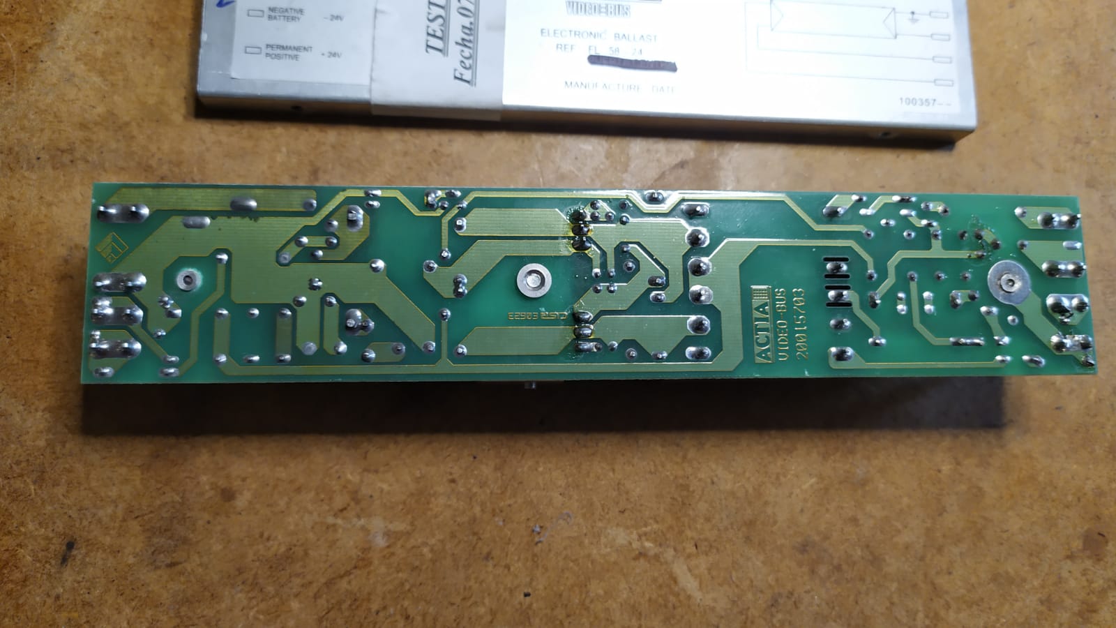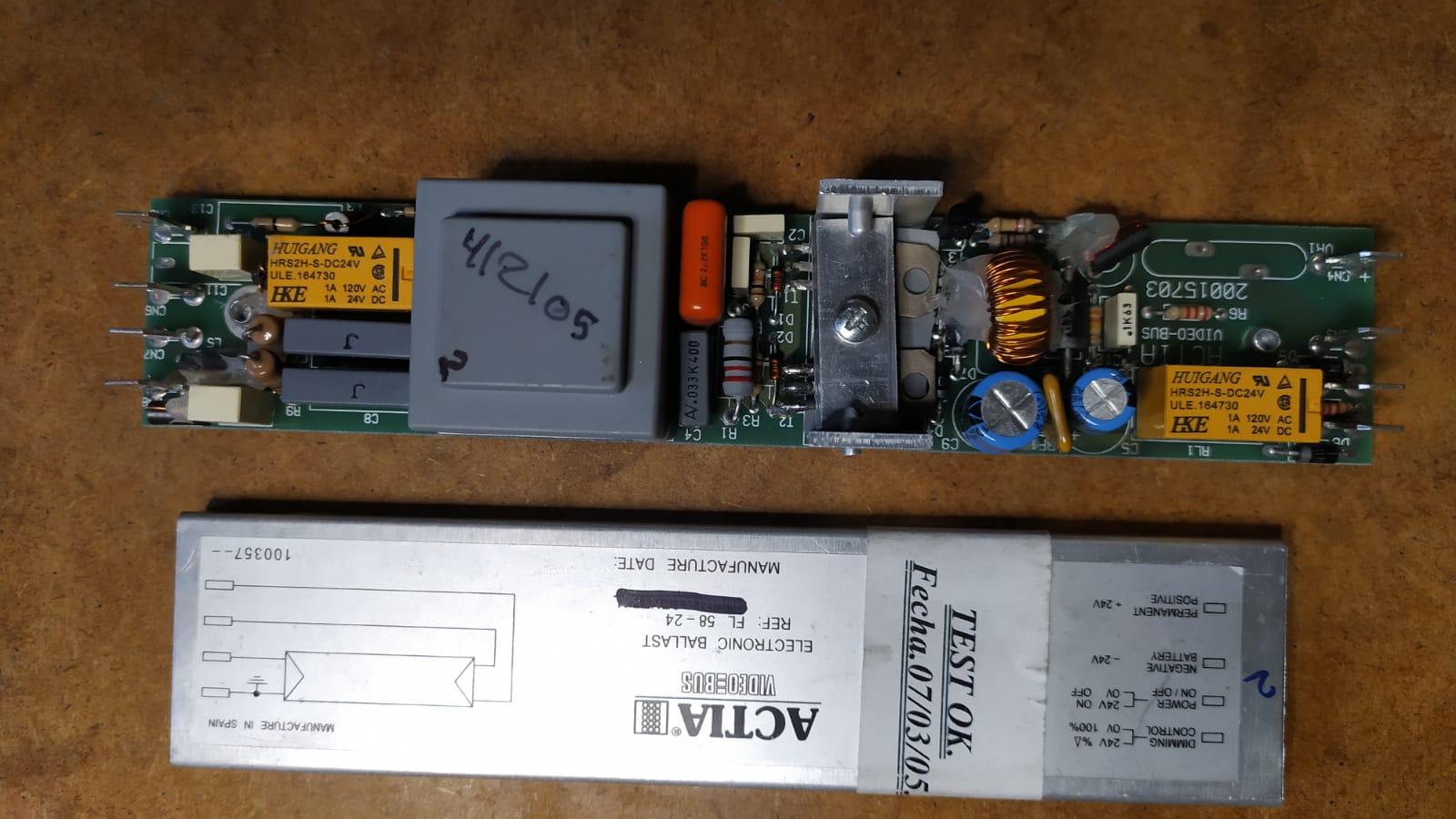 ich habe hier 2 defekte Vorschaltgeräte für Leuchtstoffröhren, die ich gene reparieren möchte. Hersteller: Actia, Modell: FL 58-24 (24= Volt Eingang, bis 58 Watt belastbar) Die Teile stammen aus einem Bus, sind dimmbar (50%) und etwas knifflig zu ersetzen (alternative Modelle haben andere Beschaltung) Die Leistungs-Transistoren sind BU407. Bei beiden war jeweils einer kaputt. Ich habe diese jeweils komplett durch neue BU407 aus vertrauenswürdiger Quelle ersetzt. Beide haben dann aber immer noch Fehlverhalten: Stromaufnahme an 24V sind 6 Ampere (mein kleines Labornetzteil bricht dann auf 19V ein). Die beiden Transistoren werden dann natürlich sehr flott heiß, so dass ich solch einen "Test" nur 3 Sekunden durchgeführt habe. alle Dioden, und der kleine Transistor (BC547) sehen "in Schaltung gemessen" eigentlich unauffällig aus. --> kann mich jemand zu einen Schaltplan für solch einen Wandler führen? Ich denke, irgendwie schwingt da der Wandler nicht an. Das sollte doch heraus zu bekommen sein, wer da den Oszillator darstellt