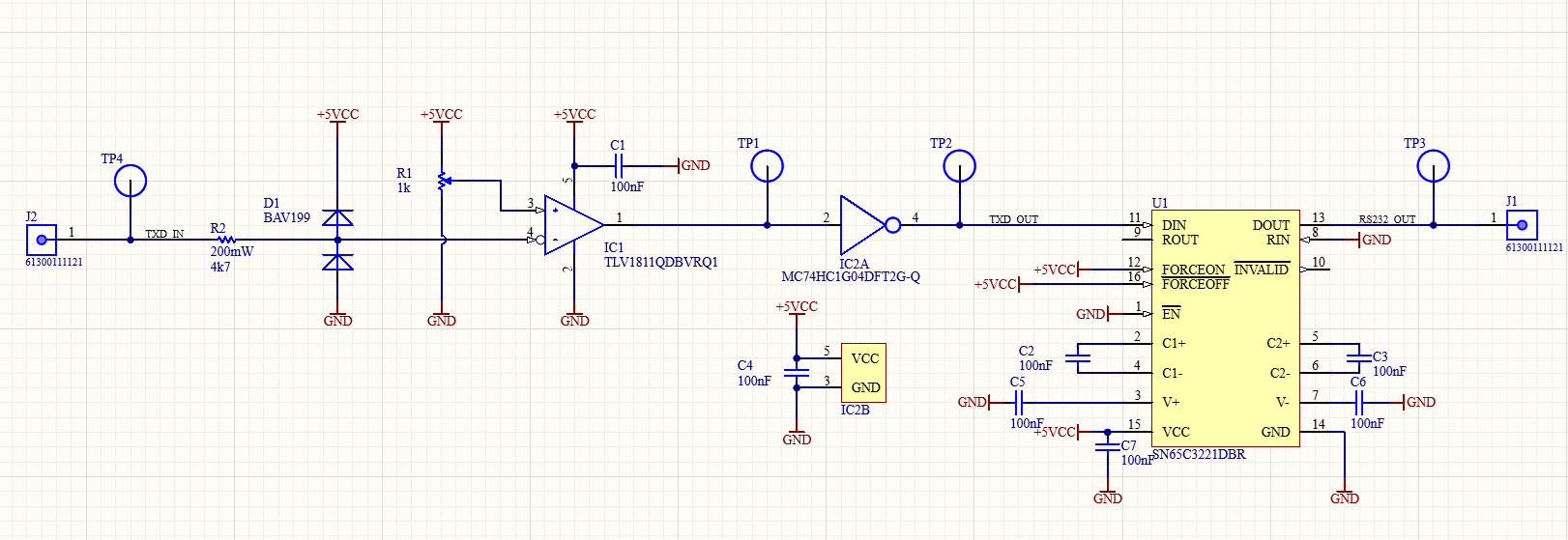 Hallo, wir stehen aktuell vor dem Problem, dass wir den RS232 Port von dem sündhaft teueren Inertialsystem VN-200 von VectorNav kaputt bekommen haben. Eine Reparatur ist nicht möglich, da das ganze INS vergossen und gekapselt ist. Die -5V vom RS232 Signal werden noch korrekt ausgegeben, die +5V erreichen nur noch 2,7V. Unsere Idee war mittels Komparator und Schutzschaltung das High Signal mit 2,7V zu erkennen und dann mit einem RS232 Treiber wieder konform raussenden. Wir sind uns nur unsicher ob die Schaltung so funktionieren kann. Für andere Lösungen / Schaltungsideen wären wir auch offen.