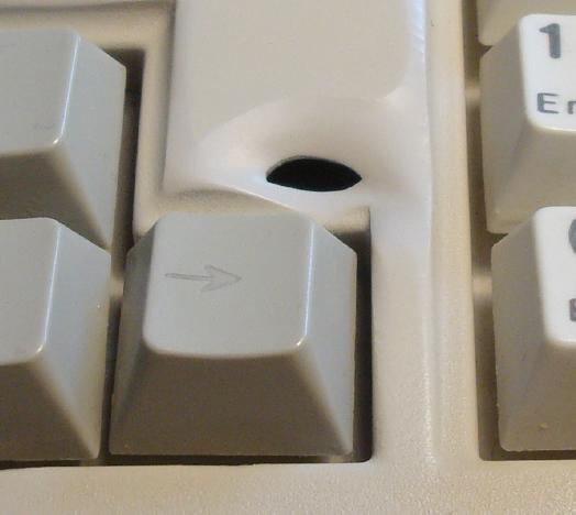 Ich glaube es war diese Tastatur, die einen sehr kurzen Kontakt mit dem Lötkolben hatte. Verletzt wurde nur die Oberfläche. Ob das untere Material weicher ist? Jedenfalls kam der massive Materialverlust samt Loch erst viel später.