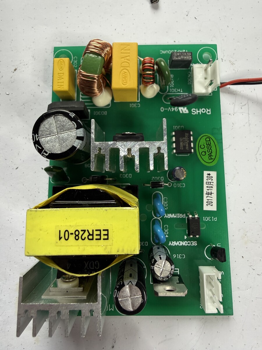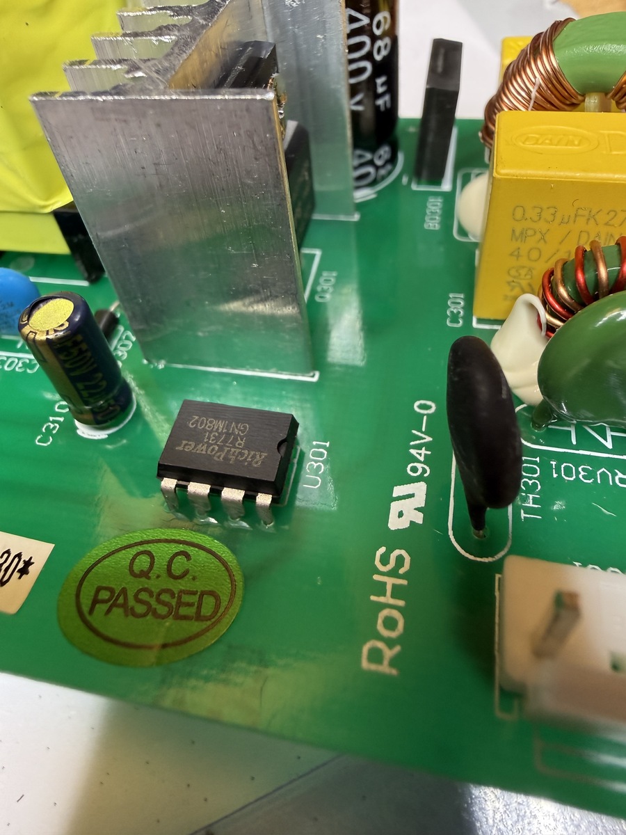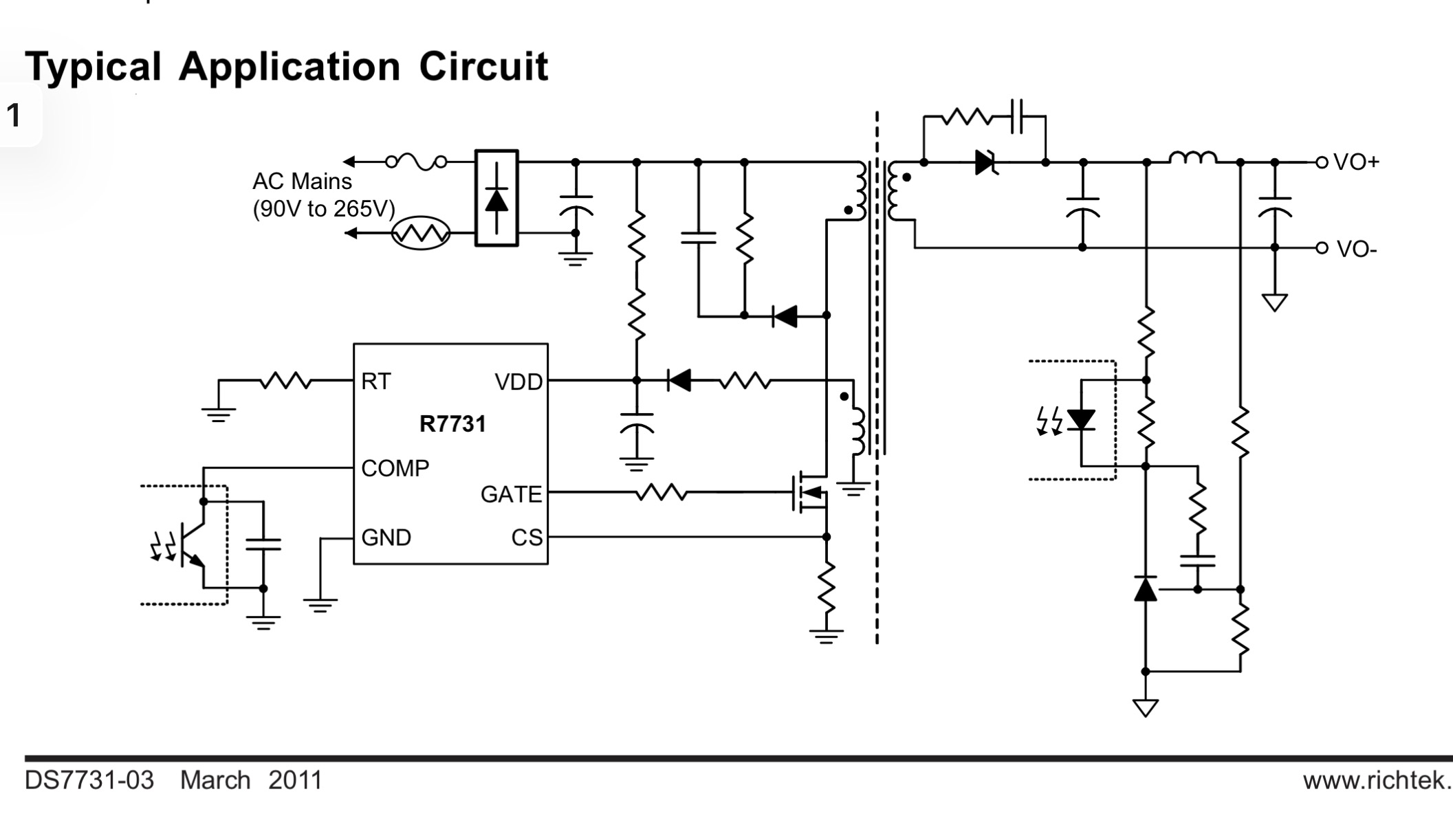 Habe hier ein Netzteil aus einer Medion Nähmaschine, das nicht funktioniert. Liefern soll es (nach Rückmessung der Widerstände am TL431) 24V und 5V über einen simplen 7805. Das Problem ist, das es anfängt zu takten nachdem sich die Spannung am Schaltregler R7731 über die Bias-Widerstände auf ca. 12V aufgeladen hat. Nach einigen Impulsen unterbricht es, die Betriebsspannung am R7731 sackt zusammen und das Spiel geht von vorne los. Auf der Sekundärseite baut sich etwas Spannung auf, aber natürlich nicht genug. Bei den Versuche speise ich das Netzteils über eine Gleichspannungsquelle 100V, Strombegrenzung auf 150mA. (Höhere Spannung auch testhalber) Was ich bis jetzt gemacht habe: - Alle Halbleiter durchgemessen, Dioden auch auf Sperrspannung. - MOSFET manuell angesteuert, Strom fließt bis zur Strombegrenzung. - TL431 samt Optokoppler auf Funktion geprüft. Schaltet sauber bei Anstieg auf 24V bis zur Primärseite durch. Optokoppler auch testhalber ersetzt. - Alle Kondensatoren geprüft, auch ESR. 10uF Betriebsspannungskondensator ersetzt. - Netzwerk D/C/R an der Primärspule überprüft. - Pfad der Strommessung am MOSFET Source überprüft, es bilden sich lt. Datenblatt erwartungsgemäß 0,9V-Nadeln aus am CS Pin. Passt zum Datenblatt. Auf den Fotos: Ich musste den 39k Widerstand R321 am TL431 ersetzen, der war mir zerbrochen. Das Oszillogramm zeigt in Blau die Gate-Ansteuerung des MOSFETs, Gelb der Verlauf der Betriebsspannung des R7731. Was mich wundert ist die Tatsache, dass die Spannung nicht höher wird wenn die Ansteuerung losgeht. Das Schaltbild aus der AppNote anbei, entspricht bis auf Kleinigkeiten dem Aufbau. Da der R7731 schwierig zu bekommen ist (oder eher garnicht) möchte ich alle Möglichkeiten ausschöpfen, vlt. hat ja jemand noch Ideen.