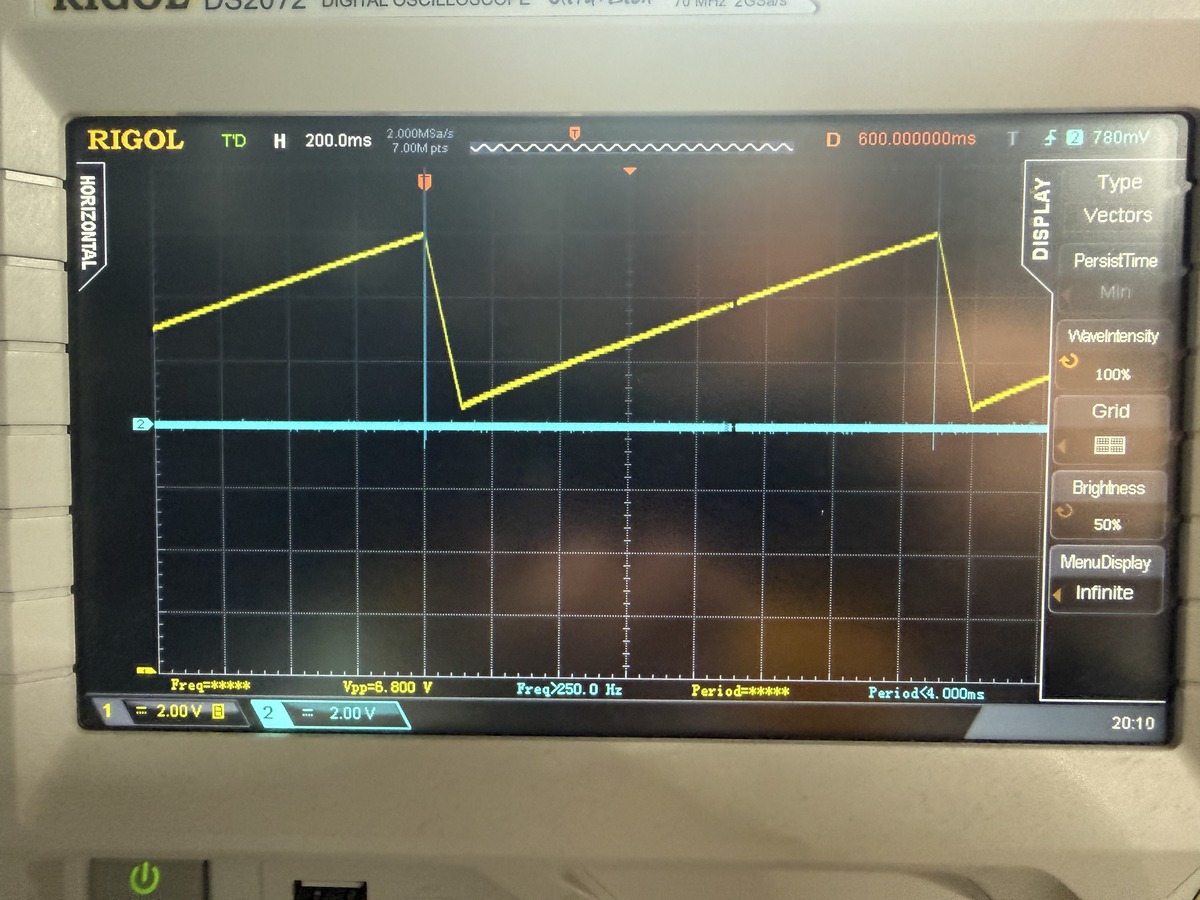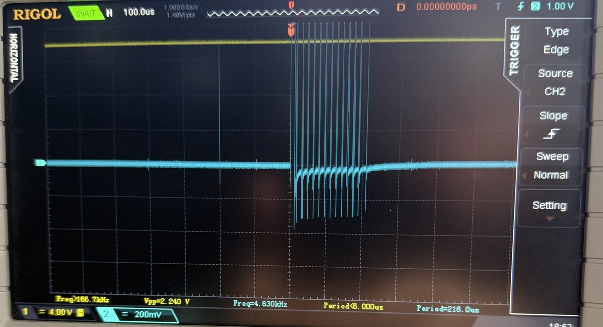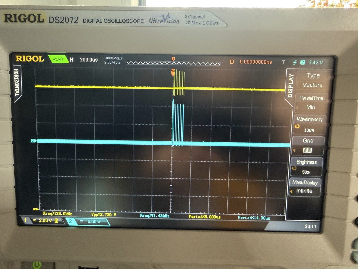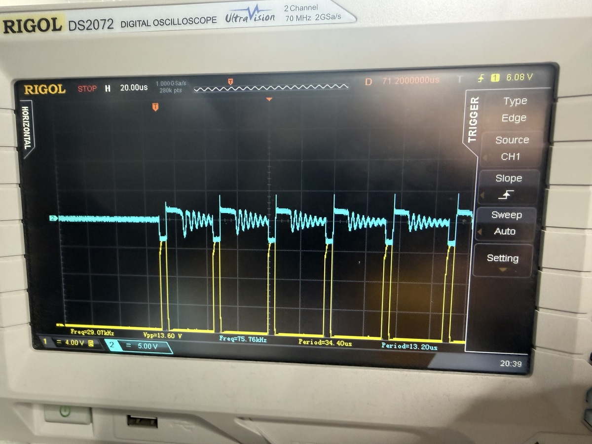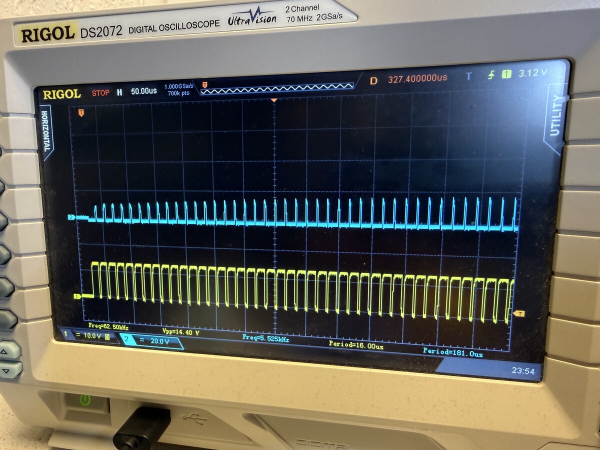 Danke für die schnellen Rückmeldungen. Ja, das Oszibild war ungenügend, jetzt besser. Die Spannung steigt bis 14V, dann geht es los. Übrigens jetzt mit 200V DC.
