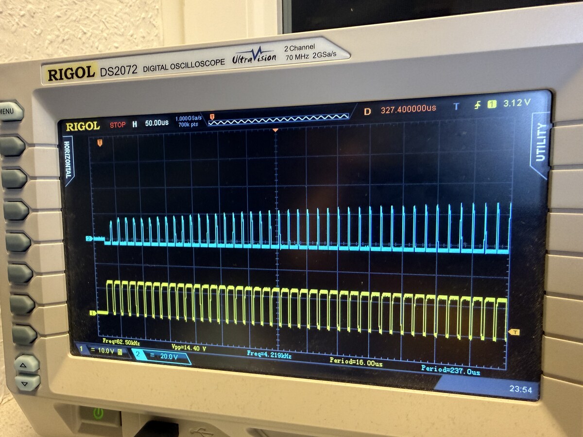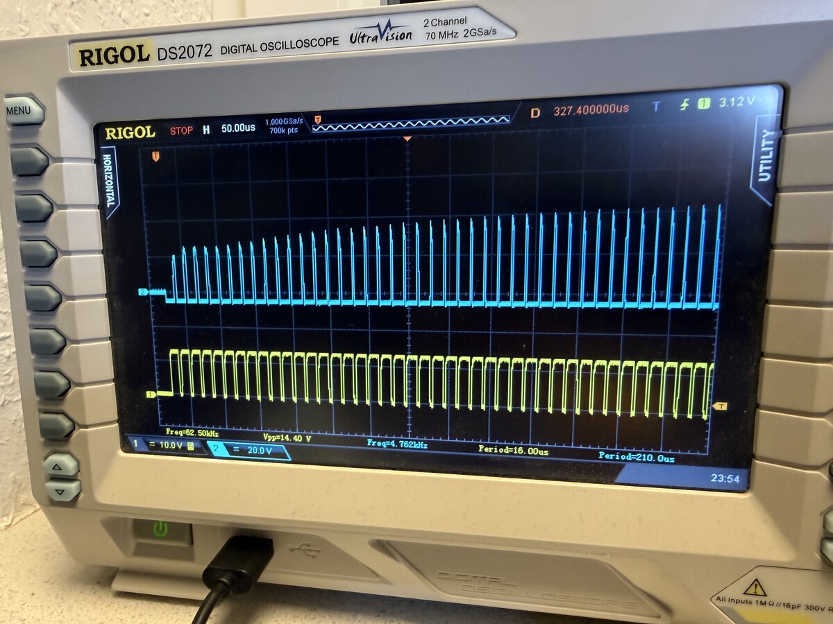15V zusätzlich an den Zwischenkreis: er macht ca. 16 Impulse am Gate, dann Ruhe. Spiel wiederholt sich jetzt 18ms.