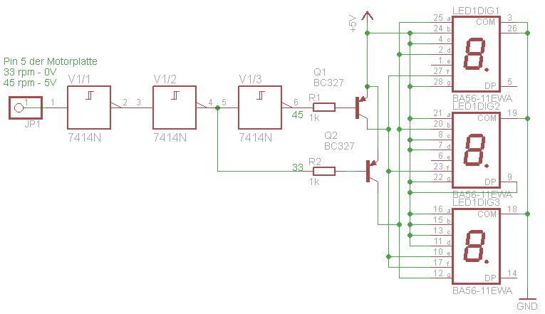 Wenn du nur die Ziffern 33 und 45 über die 7-Segmentanzeige anzeigen lassen willst, dann kannst du die Einzelsegmente auch mit Dioden ODER-verknüpfen und mit dem Geschwindigkeitsumschalter jeweils die beiden Zahlenwerte direkt ansteuern, ohne Elektronik! Falls es keine Nullstellung gibt, kannst du sogar alle Segmente die für beide Ziffern aufleuchten sollen, direkt mit der Versorgungsspannung verbinden und nur die Segmente, die für die jeweiligen unterschiedlichen Ziffern zuständig sind, direkt mit dem Schalter ansteuern. Ohne ODER-Dioden, die können dann sogar entfallen!