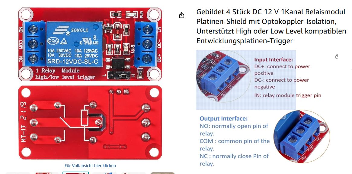 Ich hab schon diverse Forenbeiträge gelsen und da haben einige so 10€ Relaimodule Oktokopler verwendet, aber da gingen die Meinungen auseinander. Ich dachte anfangs das ich sowas nehme und so anschließe.: Bei NPN LOF bzw. BEI PNP High NPN-Variante (LOW-Trigger): Braun → DC+, Blau → DC−, Weiß → DC−, Grün → IN, Jumper/Schalter auf LOW. Ausgang zur Steuerung: COM + NO ⇒ potenzial schliesser den ich brauche. https://www.amazon.de/Gebildet-Relaismodul-Platinen-Shield-Optokoppler-Isolation-Entwicklungsplatinen-Trigger/dp/B0DPMR6YQS/ref=sr_1_3_sspa?__mk_de_DE=%C3%85M%C3%85%C5%BD%C3%95%C3%91&crid=1M2P03YM7ANJE&dib=eyJ2IjoiMSJ9.6PGOJDrqRK4ZYkjaowTLPaay2llXIOBVX9z38FK-8nuWZHAZDrvFl55wkX4lfp4fUWahvVJqvnVAl0TfAE4d6pteRxwewVjqnOwRUJMBWGCXpar2BI9ZhqWZ3ZKSOnHu21z_EAQ-BPhXm0oKJ_H6Lh4epKd12qSegyH0YQeAml9cWjuodtOh963gzD5HZdhvmtjYAIkWFFiqaL1FG-fSOmV-Gdz26FGqCVEn6V4B0kujFw3mzBVJJaH--2nH627LYk8sWLtTVS-m8lJRfkrs-CLq-2-xZuDopzYumF9iRNM.y7Dlw1M8tHS9Q_PlgjPXAPSUjwN5-xtT4BHpdjiyF80&dib_tag=se&keywords=12V-Relaismodul%2B1-Kanal-Optokoppler&qid=1762892010&s=industrial&sprefix=12v-relaismodul%2B1-kanal-optokoppler%2Cindustrial%2C108&sr=1-3-spons&aref=zQdA0e9XRB&sp_csd=d2lkZ2V0TmFtZT1zcF9hdGY&th=1