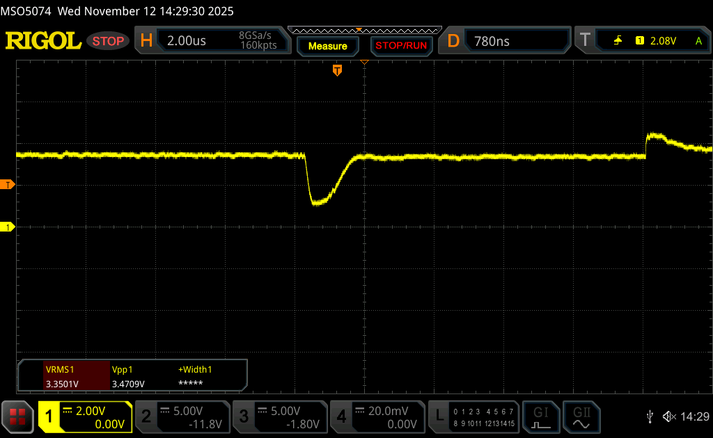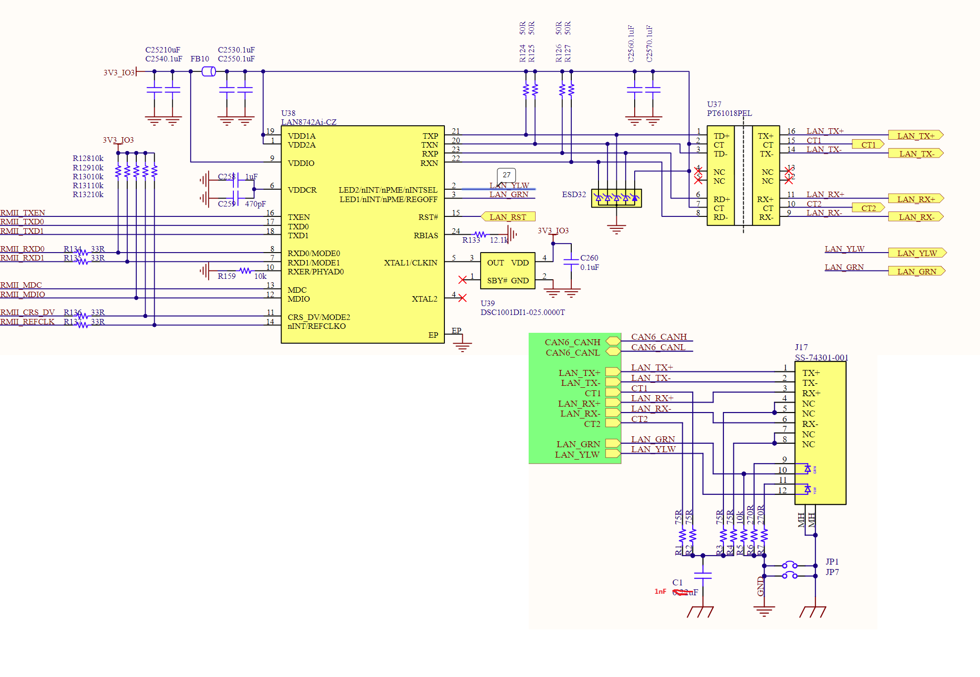 Hallo Zusammen, Ich habe hier ein Board von einem Kunden, bei welchem wir Ethernet mit LWIP implementieren sollen. Das Problem ist momentan, dass Ethernet Hardwaremäßig nicht zu funktionieren scheint, aber momentan sehe ich nicht wirklich, was genau das Problem sein soll. Nun ist bei beiden Boards nur nRST auf HIGH und REFCLK0 gibt korrekt die CLK raus, also der LAN8742 läuft. Nun zum Problem. Beim Customer Board sehe ich mit eingestöpseltem Ethernet keine Signale auf dem RJ45 RX und auf dem Ausgang der Magnetics nur so ein komisches Signal wie auf dem Bild. Beim Eval Board hingegen mit genau dem gleichen Setup (ETH und LWIP auf dem STM32 nicht initialisiert, einfach nur nRST auf HIGH) bekomme ich sofort nach dem Einstecken des RJ45 ein sinnvolles Ethernet Signal, siehe Bilder. Jemand eine Idee, was genau da los ist? Ich habe mal die Schematics verglichen und sehe soweit keine Probleme. Die 220nF von C1 wurden bereits durch 1nF ersetzt, sowie sieht die CT Spannung stabil aus (trotz fehlendem 10uF nach Ferrit).