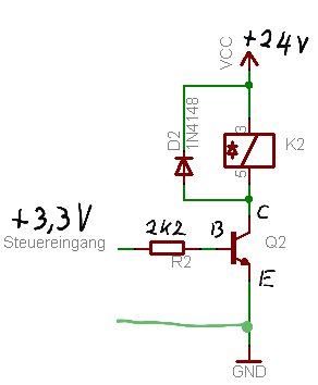 Wie viel mA braucht das 24V Relais? Liefert der 3,3V Ausgang mindestens 1mA? Das Relais mit Freilaufdiode zwischen +24V und C, E vom 2N2222 an Gnd. Den 3,3V Ausgang über 2k7 an B. Das sollte für ein 50mA Relais reichen.