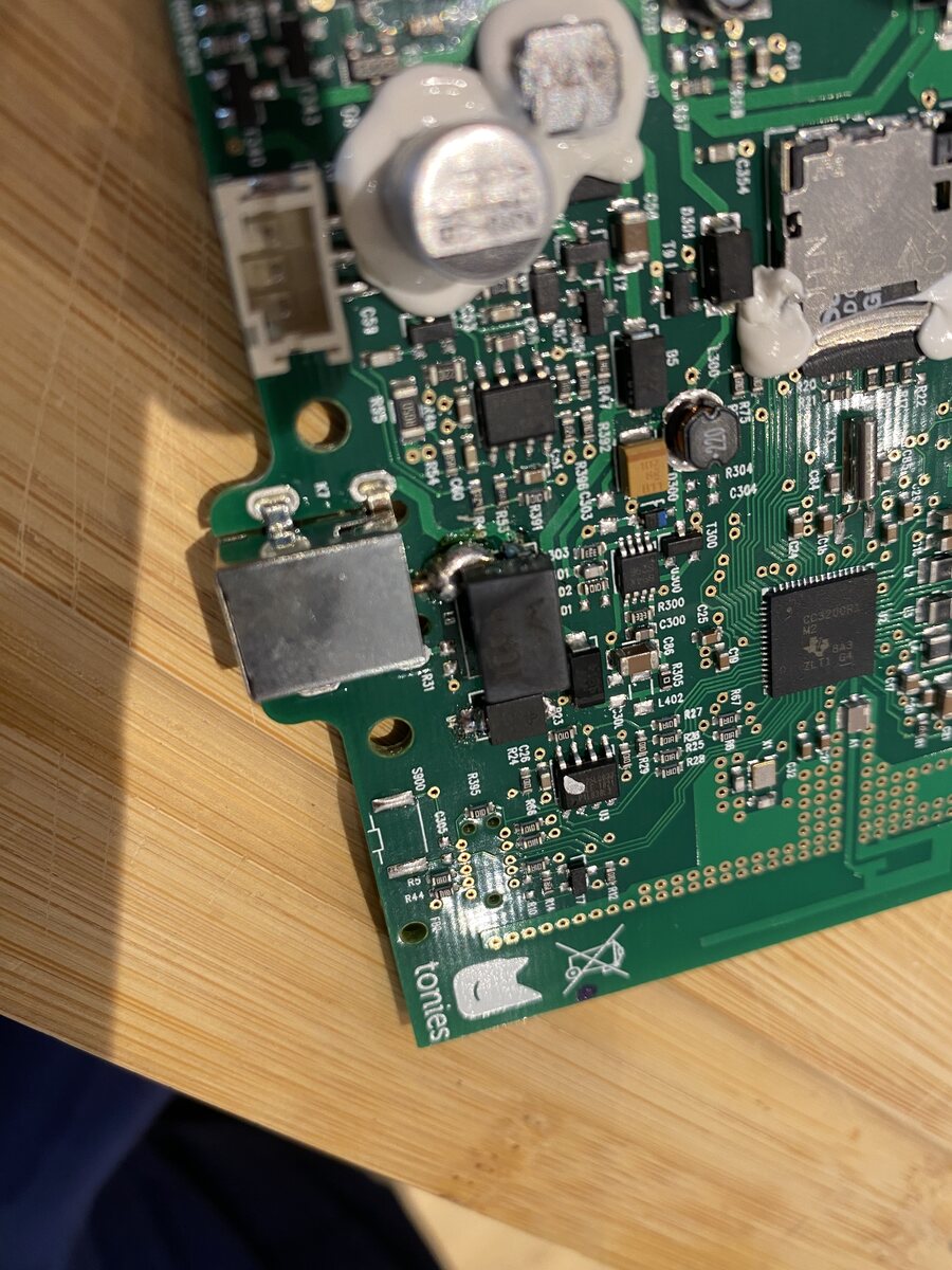 Hallo Felix, bei dem Schaltregler U300 handelt es sich um ein LM3485: https://www.ti.com/lit/ds/symlink/lm3485.pdf?ts=1763007290162 Der Regler selbst kann bis 35V ab, daher stehen die Chancen gut, dass das IC selbst nicht kaputt ist, wohl aber eines der umliegenden Bauteile. Was für ein Netzteil wurde versehentlich angeschlossen? Misst du über den gelben Tantalkondensator auch die 7,96V? Der Kondensator ist nur auf 6.3V ausgelegt, wenn ich das richtig auf dem Bild erkenne. Da könnte schon ein defekt vorliegen. Du kannst die Feedback Widerstände R302 und R303 mal messen, so erhalten wir die Größe der Soll-Ausgangsspannung. So wie ich die Beschreibung auf der GitHub Seite verstehe, wird wohl die Ausgangsspannung hinter dem Regler überwacht, wenn die nicht stimmt, scheint die Box nicht zu starten. (https://github.com/toniebox-reverse-engineering/toniebox-pcb)