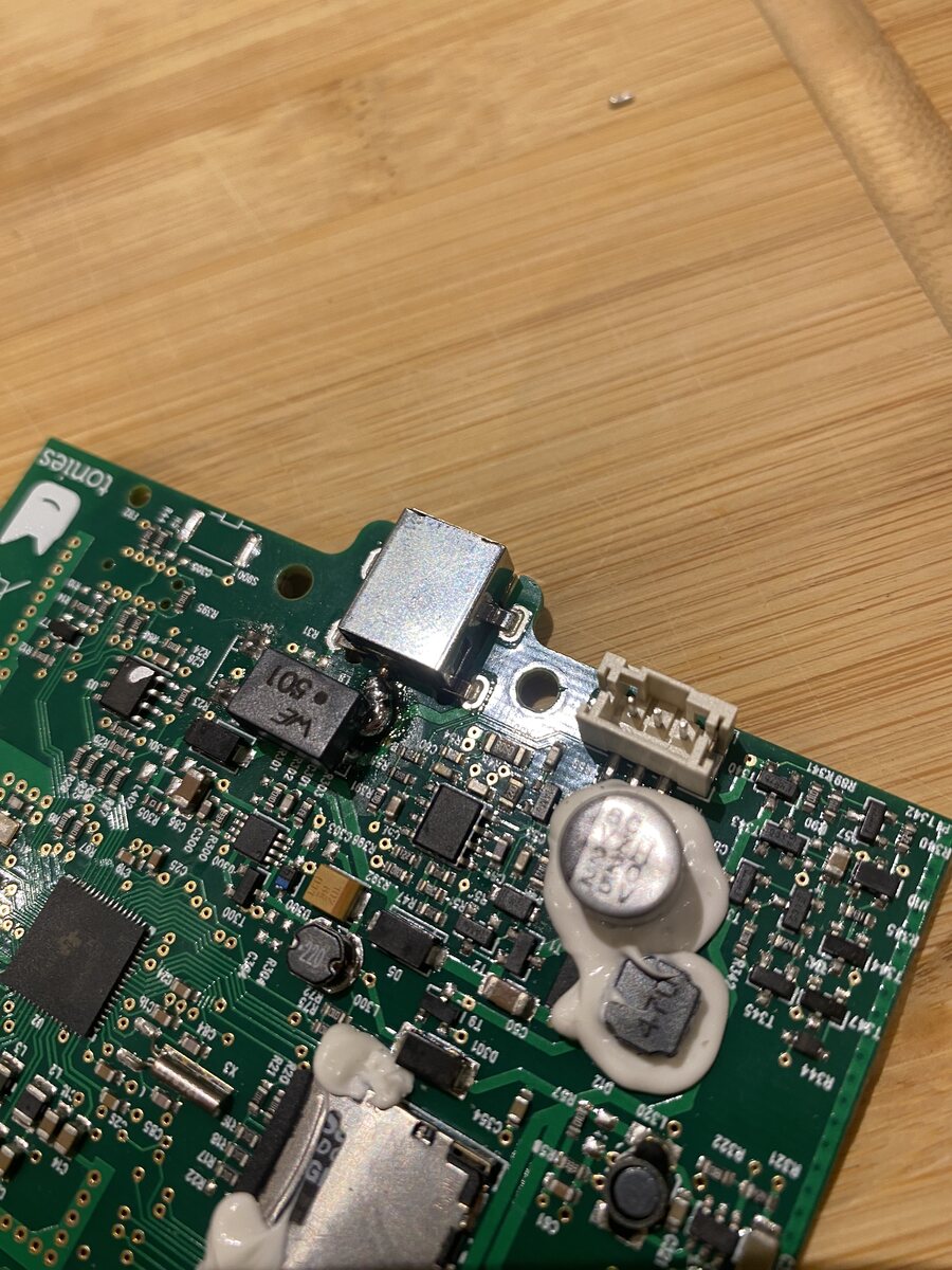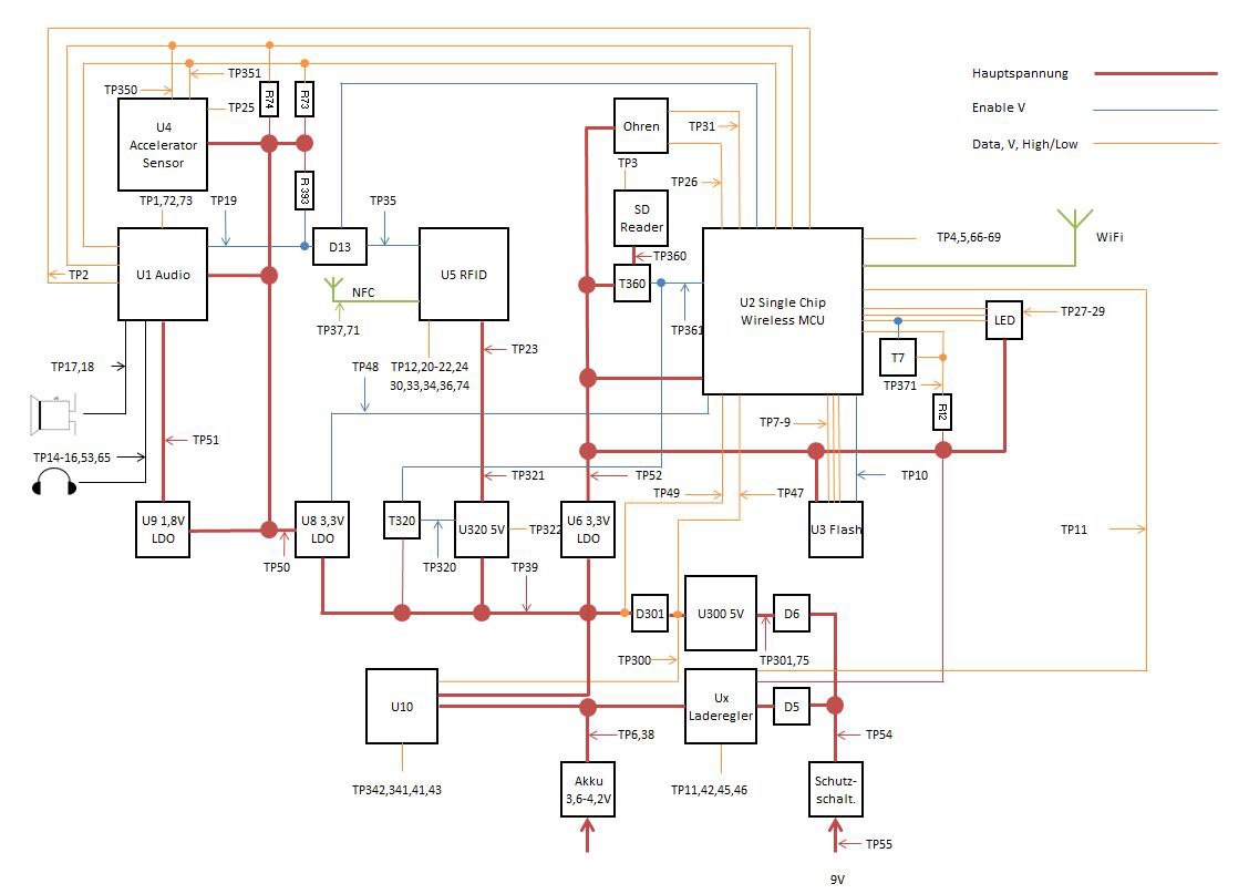 Hallo liebe Forummitglieder, Ich habe natürlich heute Abend das Forum schon durchsucht und auch etliche Beiträge zum reparieren einer Toniebox gefunden. Leider bin ich noch nicht auf mein Problem gestoßen und hab mich dazu entschlossen einen neuen Beitrag zu starten. Die Toniebox wurde an einem falschen Ladegerät angeschlossen. Daraufhin ist natürlich die DVS Diode abgeraucht und es hat auch den Linefilter erwischt. Den Linefilter hab ich ausgetauscht und die DVS Diode erst mal weg gelassen zum testen. Leider funktioniert immernoch nichts sobald ich die Platine ans orginale Netzteil anschließe. (Das Netzteil bringt 9,07V DC) Ich hab noch eine zweite Toniebox zu Hause bei dieser blinkt die grüne LED sobald ich nur die Platine einstecke. Jetzt hab ich im Internet so nen Blockdiagramm gefunden. Leider kann ich nicht sagen ob das stimmt für die Toniebox. Vielleicht kann mir hier aber jemand helfen um den Fehler durch die Messpunkte zu finden. Ich muss noch dazu sagen das ich den Linefilter nicht sauber ausgelötet habe. Hier hab ich unten links die Leiterbahn beschädigt, sodass ich hier nichts mehr anlöten konnte. Diese hab ich kurzerhand auf die 9V Plus vom Netzteil gelötet ich hoffe das passt so. So das war jetzt erstmal viel Input ich hoffe mir kann hier jemand weiter helfen! Mit freundlich Grüßen suhly