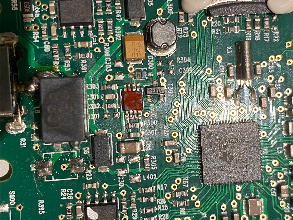 Vielen Dank für die schnelle Hilfe! Hier meine Messergebnisse: TP54: 9,06V TP301: 9,04V TP75: 9,04V TP300: fängt mit 8,4V an und pendelt sich bei 7,96V ein D300: 7,97V Ich vermute du meinst den Spannungsregler U300 oder? Wenn ich mir das so richtig anschaue würd ich dann sagen das der U300 ein Treffer hat weil er nicht auf 5V regelt? Seh ich das richtig? Ist es das rot markierte Bauteil? Noch als kleine Ergänzung mit aufgeladenem Akku funktioniert die Box ohne Probleme. Vielen Dank!