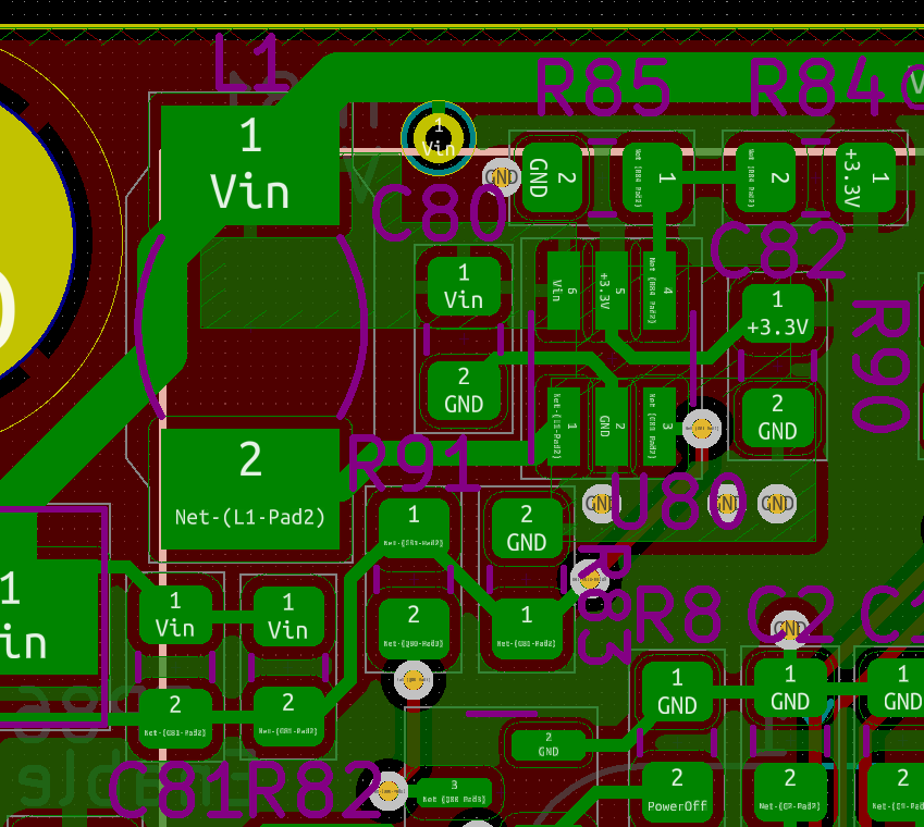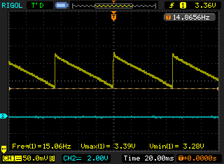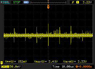 Hallo, vielleicht kann mir ja jemand sagen, wie ich die Störungen auf meiner Vcc Leitung reduzieren kann. Zunächst das Gute: Die LEDs meiner 5x5 RGB LED Matrix leuchten Der STM32F405 lässt sich per USB Programmieren Die SD Karte ist auch ansprechbar Und per DAC kann ich an den 0,2W Lautsprecher Töne ausgeben. Aber, je nach Anzahl der leuchtenden LEDs gibt der Lautsprecher auch ungewollt Töne aus. Dabei scheint es vor allem bei geringer Last zu Knackgeräuschen zu kommen. Und schaue ich mir die Vcc Leitung an, ist die alles andere als eine Linie. Zum Einen treten periodisch hochfrequente Störungen auf (die man nicht hört) und zum anderen bricht die Spannung immer wieder kurz ein (was man hört). Beides in voltage-leds-off.png zu sehen. Beim Layout und den Werten für den MCP1640 habe ich mich so weit wie möglich an den empfohlenen Werten des Datenblattes orientiert. Aber schon bevor ich den STM drauf gelötet hatte, habe ich die Spannung kontrolliert und war von den minimal und maximal Werten überrascht (step-up-no-load.png). Halte ich einen 220µF Elko an Vcc und GND wird das Bild besser und ich höre nichts mehr im Lautsprecher, aber von gut kann keine Rede sein. Also was lässt sich verbessern? Der MCP1640 soll als Ausgangskondensator mindestens 10µF und maximal 100µF haben. Dass es ein Minimum geben muss ist, klar aber ein Grund für ein Maximum erschließt sich mir nicht, außer dass es für den MCP1640 irgendwann wie ein Kurzschluss aussehen würden.
