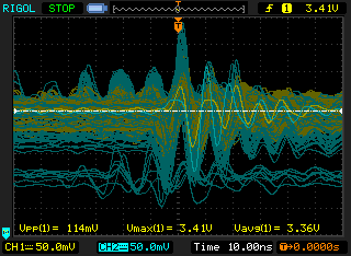 Malte _. schrieb: > Tastkopf, ich habe mal ein Foto angehängt. Ich sehe dort eine ziemlich große Leiterschleife, die als Magnetfeldsonde fungiert und magnetische Felder, verursacht bspw. durch Ströme in der Umgebung, empfängt. > Ich würde die als periodisch alle 15µs betrachten, das wären 66kHz ... Schaltfrequenz des Wandlers?