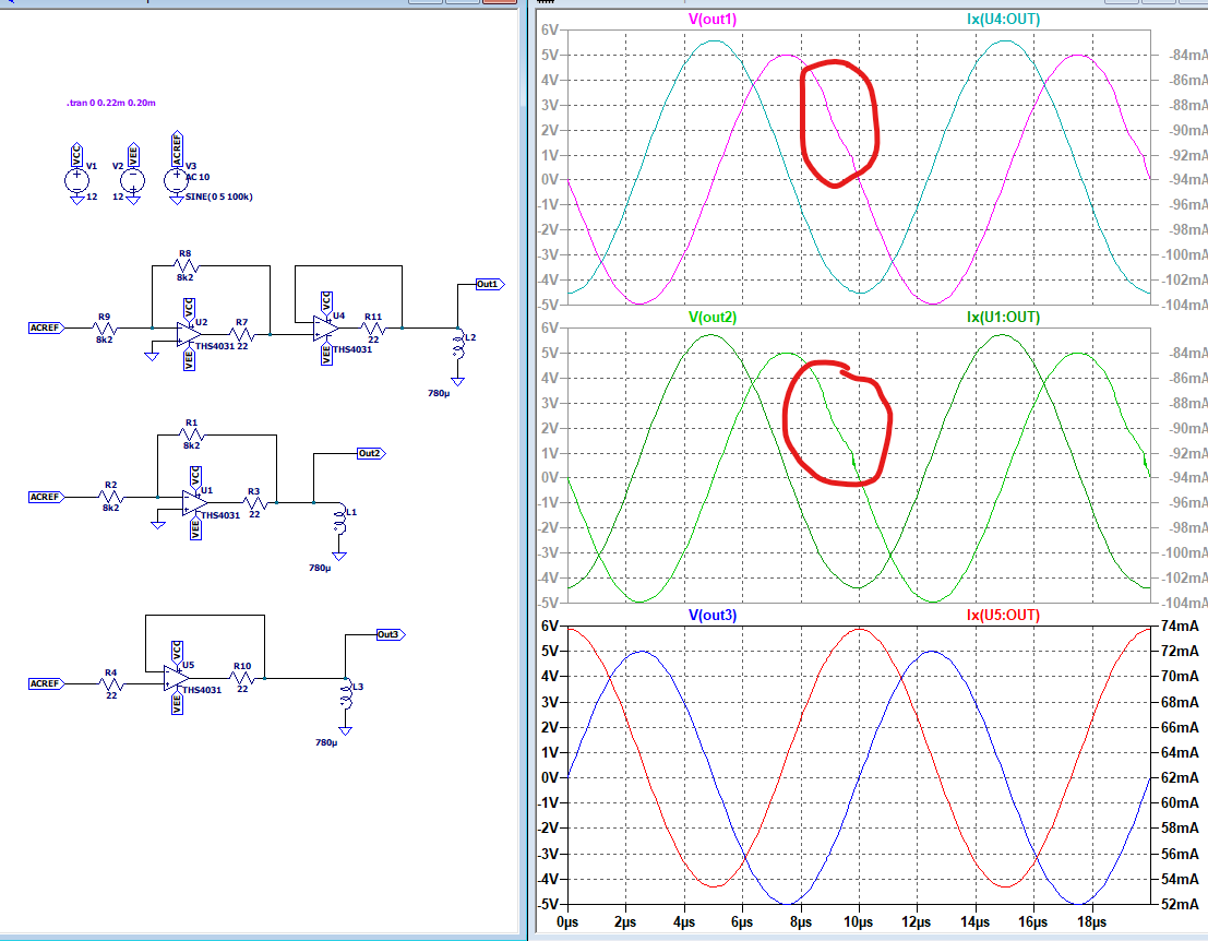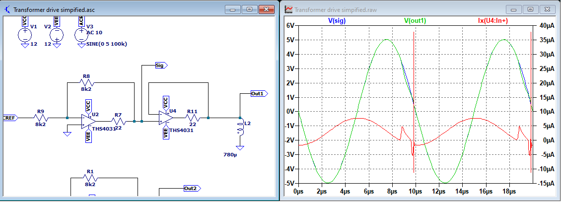 Hallo zusammen, ich habe aktuell ein Problem mit einem Operationsverstärker und einem Übertrager (Trafo). Kurz: Ich habe eine Opreationsverstärkerschaltung und möchte das Signal (100kHz 10Vpp Sinus) wo anders einkoppeln. Das Bild zeigt die Schaltung in LTSpice stark vereinfacht und in 3 "Testvarianten" um das Problem zu verdeutlichen. Als OpAmp habe ich einen THS4031 aufgrund seines sehr guten Rauschverhaltens. Wenn ich ihn in einem invertierenden OP-Schaltung verwende erhalte ich immer eine "Beule" in dem Sinus, da der OP wohl mit der Rückspeisung der Spule nicht zurecht kommt (Siehe Out2 in Simulation). An dem Schaltungsteil des THS4031 mit den 8k2Widerständen kann ich nicht viel ändern, weshalb ich versucht habe das Signal zu Buffern (OUt1). Das klappt aber irgendwie nicht. Wenn ich den THS4031 direkt dran hänge ohne die invertierende OP-Schaltung mit den 8k2 Widerständen (Out3), dann funktioniert es wieder. Kann mir jemand erklären, warum das mit dem Buffern so nicht klappt? Bzw. weiß jemand einen alternativen OpAmp oder Schaltung wie ich das Signal nach der invertierenden OP-Schaltung (Out2) in die Spule des Übertragers einkoppeln kann? Viele Grüße und Dank im Voraus David