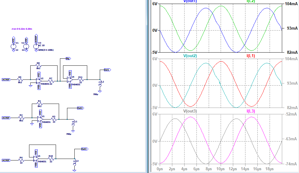 Wie man sieht, treten hier Strommaxima auf die den Op eher überfordern. Die Spannungsverzerrungen im Nulldurchgang fallen zusammen mit den Strommaxima des um 90 grad verschobenen Magnetisierungsstromes. Ganz wie man es erwarten darf. Und man sieht auch einen DC-offset. Offenbar ist die Spuleninduktivität deutlich zu klein.