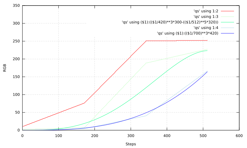 Uwe D. schrieb: > für eine Funktion entscheiden (z.B. Polynomisch, Potenz, Logarithmus) Genau da liegt das Problem. Die verfügbaren Funktionstypen passen nur schlecht zu den Intensitätsverläufen in den Kanälen, d. h. man landet bestenfalls bei hoher Ordnung der Funktion und hat trotzdem noch systematische Fehler. Uwe D. schrieb: > Auf jeden Fall machen und nicht klugscheißen. Genau das: Probier's aus, statt hier große Sprüche zu klopfen. Da der TO RGBW zur Verfügung ist, ist man wegen des besseren CRI zudem gut beraten, nicht nur eine reine RGB-Tabelle zu verwenden, sondern auch die weißen LEDs mit einzubeziehen. p.s. So schlecht ist eine abschnittsweise lineare Approximation gar nicht.