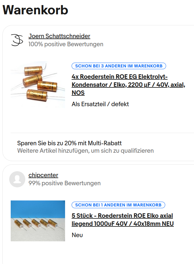 Welle 🧐 S. schrieb: > Doch Frolyt gibt es noch, NOS xD Egal, welches Fabrikat: Wenn dann nur nagelneue aus bekannter Herkunft kaufen! Die Dinger haben ein zähflüssiges Elektrolyt drin, welches über die Jahre austrocknen kann. Wenn man dann welche aus zweifelhafter Quelle ("NOS") kauft, kann es sein dass man vom Regen in die Traufe kommt. > Sind die im Bild ok? Röderstein sind ja noch viel schlimmer! Kauf was vernünftiges! Ein paar Markenfabrikate wurden ja schon genannt.