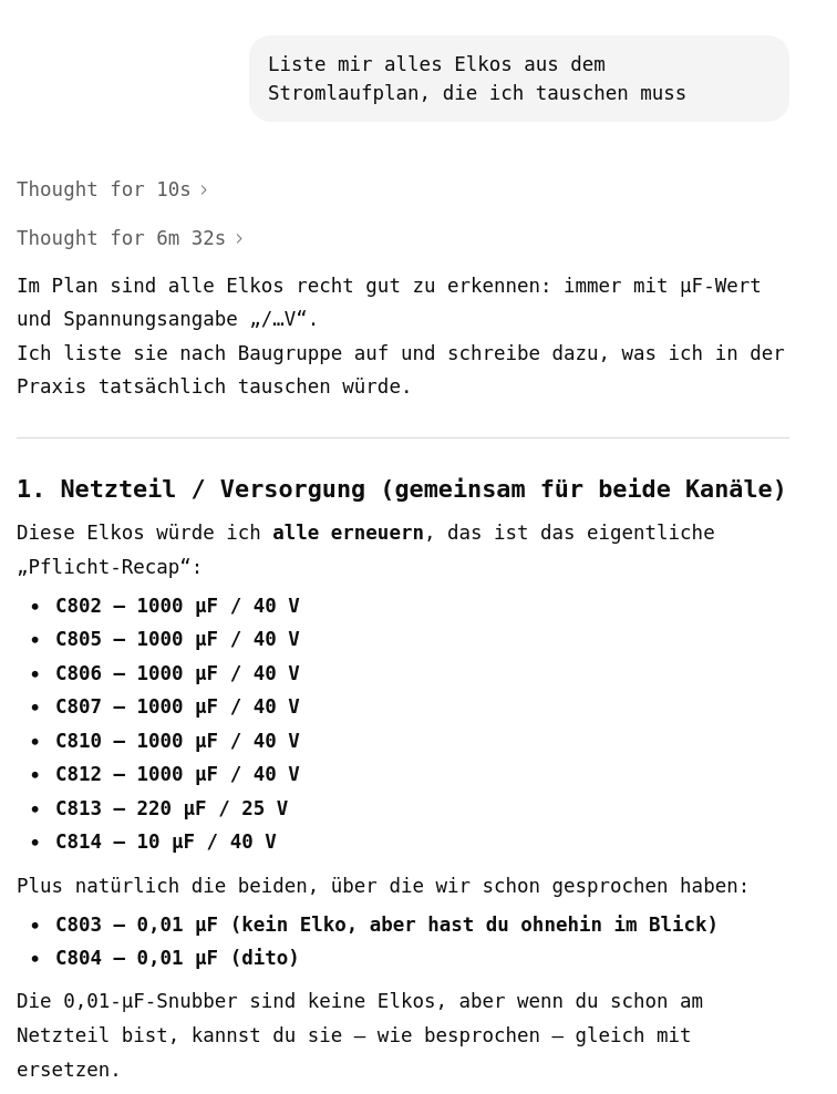 Ich war etwas faul und habe den Stromlaufplan meinem neuen Feund hochgeladen der macht mir auch gleich eine Liste für Reichelt. Ich habe ihn nach den Pflichttausch gefragt. Er hatte mir auch gleich die Elkos im Signalweg/Verstärker erklärt und eine Tauschliste erstellt. Das lass ich aber erstmal ;)
