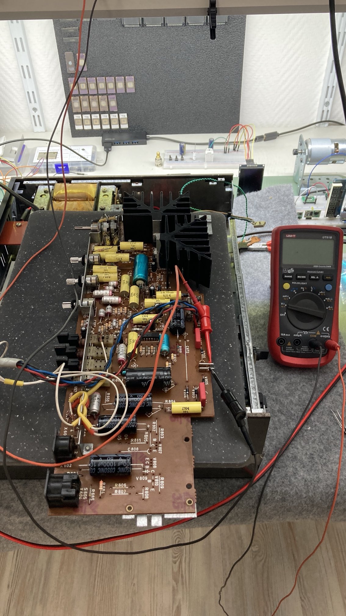 Matthias S. schrieb: > Kriegst du heute gar nicht mehr. Klar, gibt es die noch: https://frolyt.de Welle 🧐 S. schrieb: > Er hatte mir auch gleich die Elkos im Signalweg/Verstärker erklärt und > eine > Tauschliste erstellt. Na klar, Dein Freund ist also ein Elko Schnelltauscher. Wenn man nicht weiter weis oder den gar nicht erst mal richtig analysiert hat, dann tauscht man erst mal die Elektrolytkondensatoren. Den Signalweg würde ich erst mal gar nicht anfassen. Als erstes muß das NT wieder funktionieren. Also, wenn Du den Trafo absteckst dann bleibt die Sicherung heile. Gut wäre es wenn man prüfen würde ob der Trafo incl. Sicherung auch unter Last korrekt funktionieren. Ein geeigneter Lastwiderstand wären z.B. 2 Autoglühlampen 12V/21W in Reihe, da fließen etwas mehr als 0,8A. Im 2. Schritt mal die Kondensatoren C802, C803 und C804 auslöten und auf Kurzschluß prüfen, auch wenn C802 vermutlich nicht die Ursache ist, da lt. Deiner Beschreibung die Dioden kaputt gehen. Jetzt die Dioden raus löten. Bei gezogenen Sicherungen F802 und F803 könnte man jetzt die Elkos C805, C806 und C807 auf Kurzschluß und, wenn möglich, auf Kapazität, prüfen. Achtung bei der Kurzschlußprüfung kann wegen des Ladestroms kurzeitig ein sehr geringer Widerstandwert angezeigt werden - also einen kleinen Moment warten. Bei 3x1000µF müsste man 3000µF +/-20% messen. Wenn die Prüfungen in Ordnung sind, dann können diese C's auch nichts dafür. Jetzt neue und intakte Dioden einlöten. Unbedingt prüfen ob man diese auch richtig herum eingelötet hat, da passieren schnell mal Fehler. Die C's 802, 803 und 804 sowie die Sicherungen F802 und F803 bleiben weiterhin draußen. Jetzt mal den Trafo anstecken. Die Sicherung F801 sollte jetzt nicht mehr fliegen. Funktioniert das jetzt C802, C803 und C804 wieder einlöten, sofern diese in Ordnung sind ansonsten ersetzen.