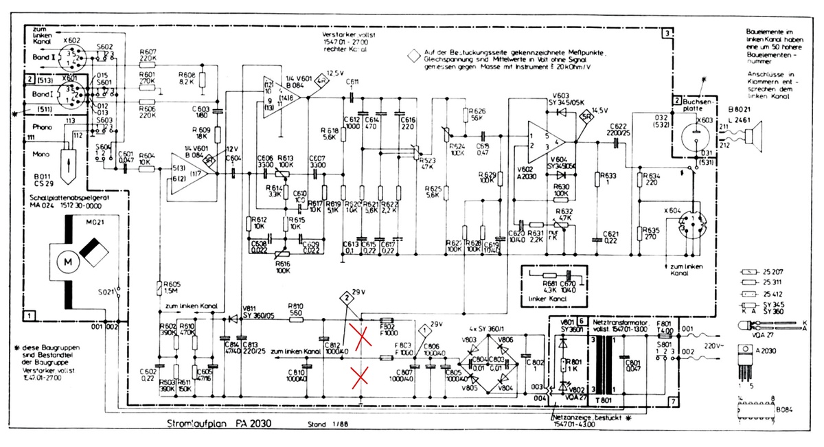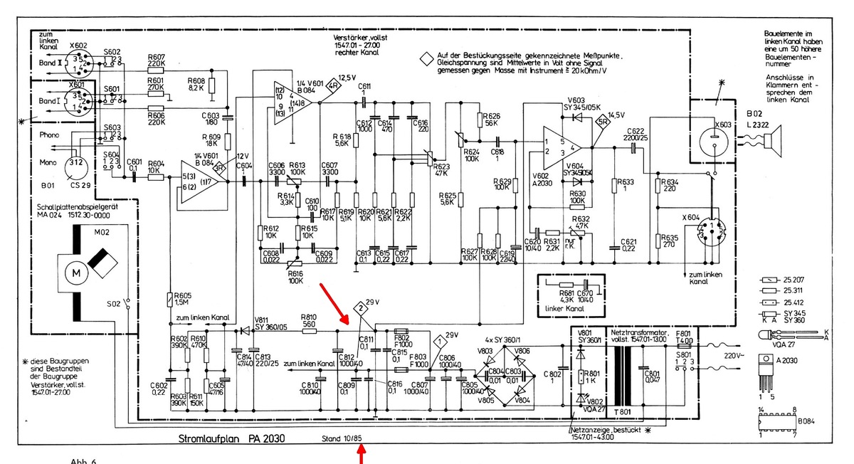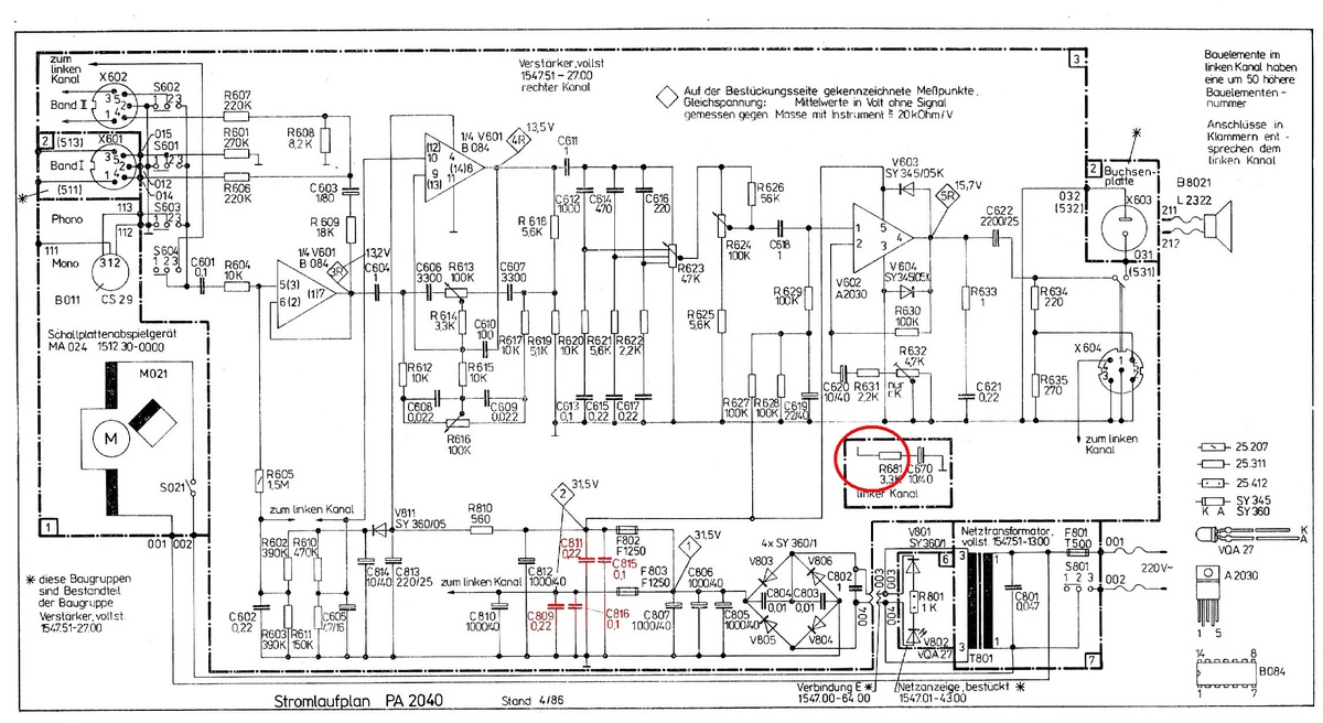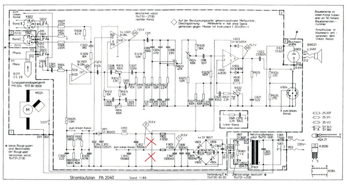 Ich noch mal... Hier noch der Plan zum PA2040 im Stand 1985. Gegenüber dem PA2030 gibt es nur größeren Trafo (mehr NF-Leistung) und ein R ist verändert. In der Version von 1988 sind dann die gekennzeichneten Kondensatoren entfallen. Vielleicht rührt daher auch der Zeichenfehler in der 88er Version. Das Alles hat aber nichts mit dem Fehlerbild, welches der User so krude beschrieben hat, zu tun. Old-Papa PS: Das ganze Servicemanual habe ich mal auf meiner Datenhalde abgelegt: https://www.old-papa.eu/dokumente/PA_2030_Su.pdf
