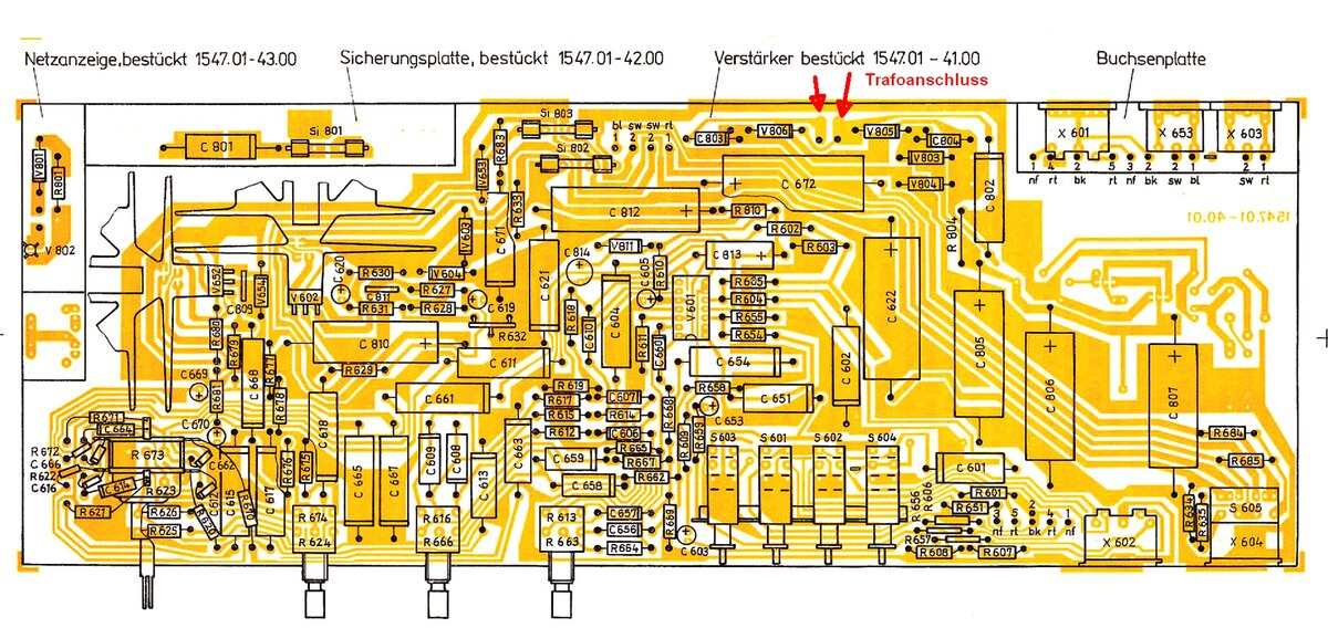 Ich habe doch die ganzen Serviceunterlagen in meinem Fundus (allerdings unter "Verstärker") Also, hier zumindest mal Pläne mit roten Anmerkungen von mir und die Platine in Draufsicht (Durchsicht) Die Schaltung vom PA2030 und 2040 unterscheidet sich nur(?) in der Spannung vom Trafo (und wohl höherer Ausgangsleistung) und es gab (für beide Versionen?) noch eine Änderung mit zusätzlichen Kondensatoren. Jetzt sollte das sogar mein Enkel (9 Jahre) schaffen... ;-) Old-Papa
