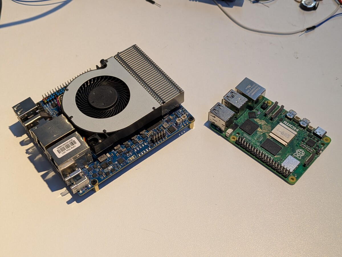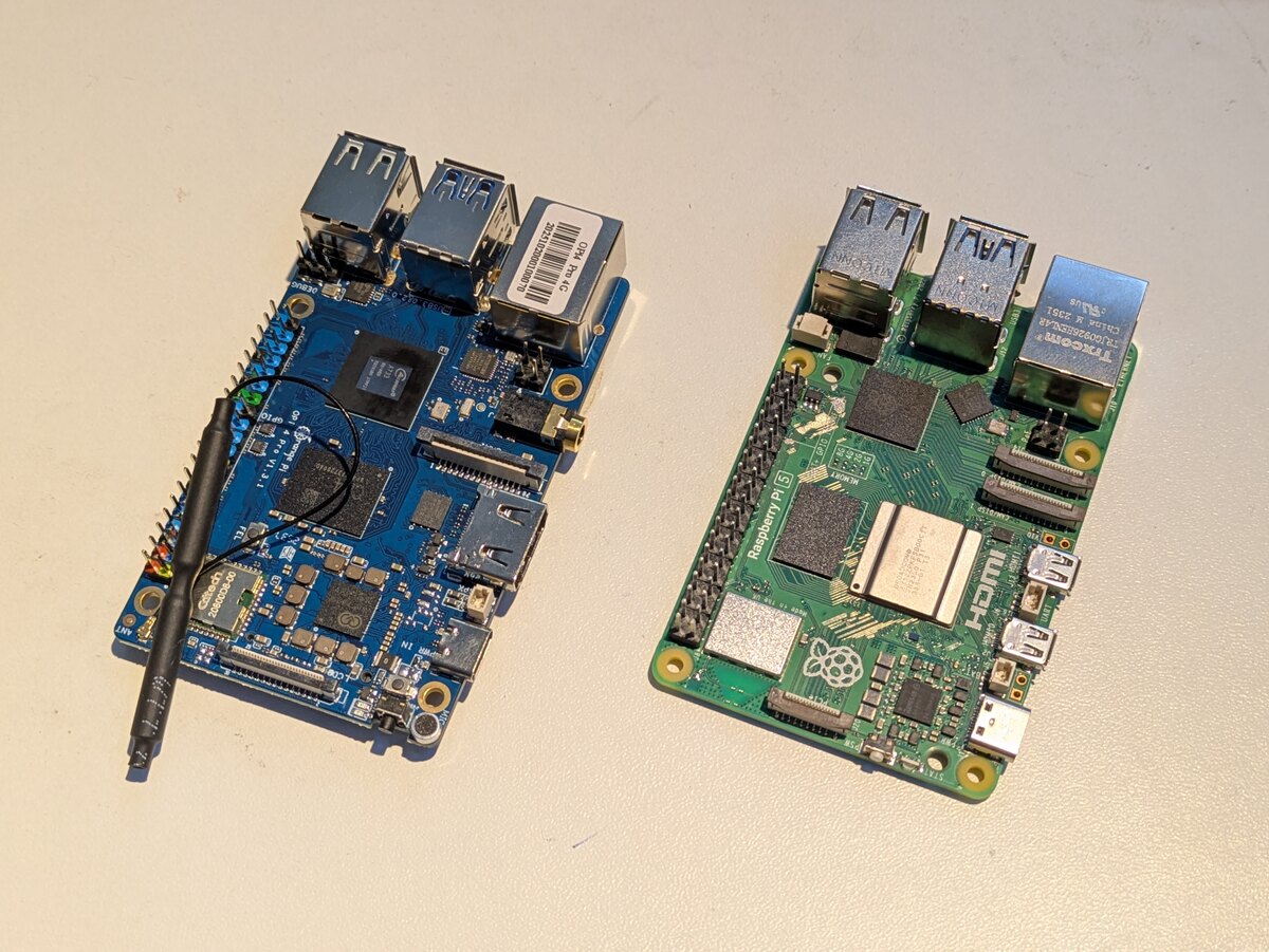 Uptons Nahebeziehung zur Broadcom sorgt dafür, dass der Raspberry Pi immer mit einem Broadcom-SoC ausgeliefert wird. Auch mit dem gut erprobten Kreditkarten-Formfaktor experimentiert man nur höchst ungern. Shenzhen Xunlong hat im Laufe der letzten Jahre vor allem größere Platinen ins Rennen geschickt - aus dem „Mehr“ an Platinenplatz folgte logischerweise ein Mehr an Platz für Komponenten und unterm Strich mehr Arbeitsspeicher bzw. mehr Rechenleistung. Mit dem Orange Pi 4 Pro steht nun ein Achtkerner ante Portas, der - wie in der Abbildung gezeigt - vom Formfaktor her dem Raspberry Pi 5 fast identisch ist.