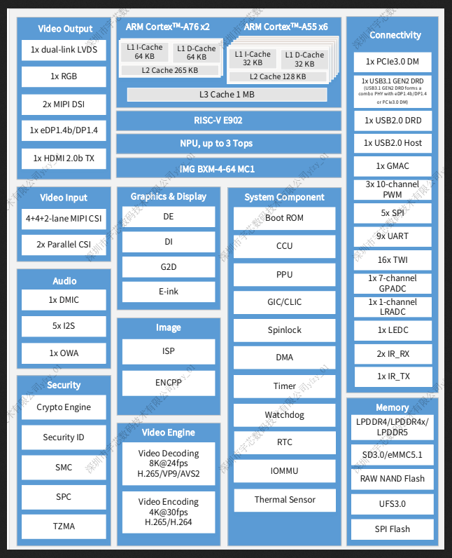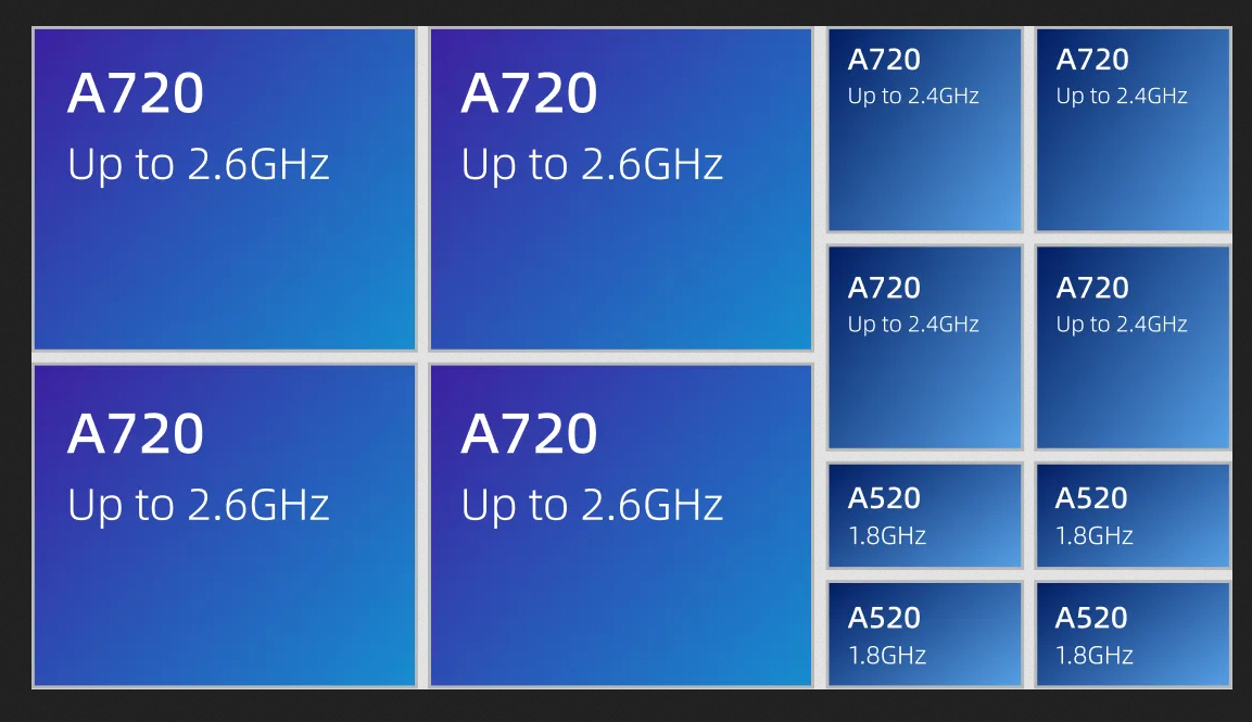 Als System on Chip kommt hier ein Allwinner A733 zum Einsatz. Die konsequente Umsetzung der Big Little-Architektur zeigt sich in der folgenden Abbildung.