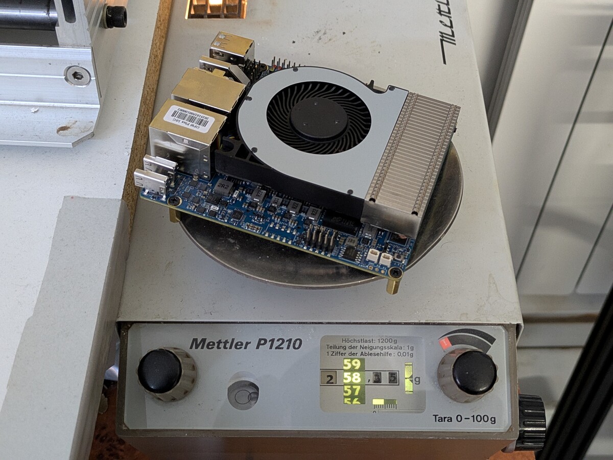 Mit dem Orange Pi 6 Plus zeigt Shenzhen Xunlong der Prozessrechnerindustrie, wie die Wefze die Ruhe lernt. Die gigantischen Dimensionen des Prozessrechners und das enorme Gewicht sind sowohl auf der Waage als auch im Größenvergleich klar erkennbar.