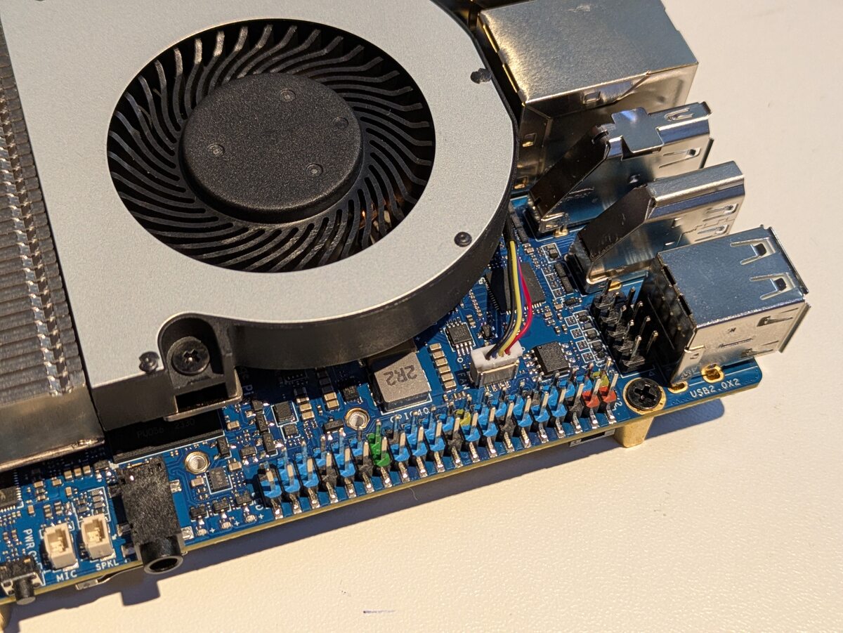 Interessant sind die auf der anderen Seite befindlichen GPIO-Header. Neben dem üblichen 40 Pin-Port gibt es auch einen neuen Pin-Adapter, der USB2-Signale zur Verfügung stellt. Dies kann nützlich sein, wenn ein USB-Modul (man denke beispielsweise an hauseigene 4G-Hardware) Vibrationssicher und permanent mit dem Prozessrechner verbunden bleiben muss. Zu beachten ist, dass WiringOPi derzeit nicht zur Verfügung steht. Der Code lässt sich zwar kompilieren, die Ausführung des readall-Testbefehls scheitert allerdings aufgrund des Fehlens von Unterstützung für den vorliegenden Rechner: