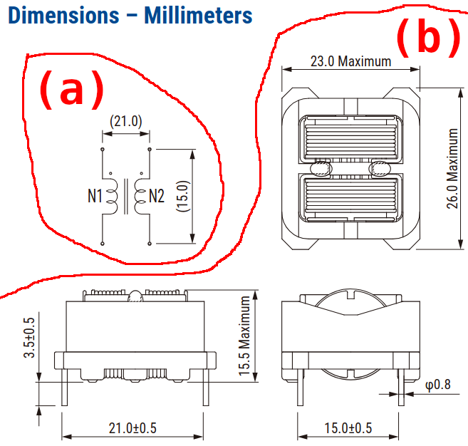 Hi, ich möchte gerne in KiCad das Footprint für das folgende Bauteil erstellen: https://www.mouser.de/ProductDetail/KEMET/SSHB21H-R041250?qs=sGAEpiMZZMtyFaoUegSfpqS9X5XzdbyZzrBV%252BXOxaAKaw2HNJxM3OQ%3D%3D Allerdings verstehe ich nicht wie die Pinbelegung zwischen dem Schaltsymbol (markiert als (a) in common_mode_choke_datenblatt.png) und dem Footprint (markiert als (b) in common_mode_choke_datenblatt.png) ist. Übersehe ich hier etwas, oder ist das nicht ganz eindeutig? Zudem finde ich das Phi-Symbol beim Durchmesser des Drahts verwirrend. Ich schätze mal, das sollte das Durchmessersymbol sein, oder? Grüße und schönen Sonntag