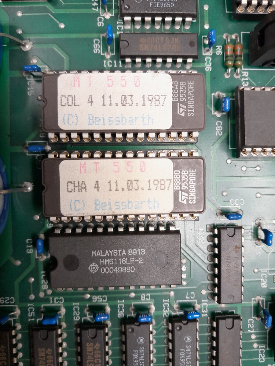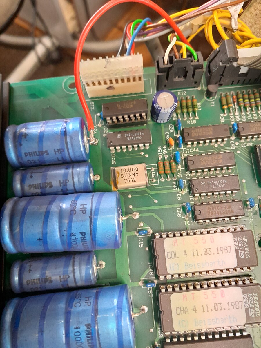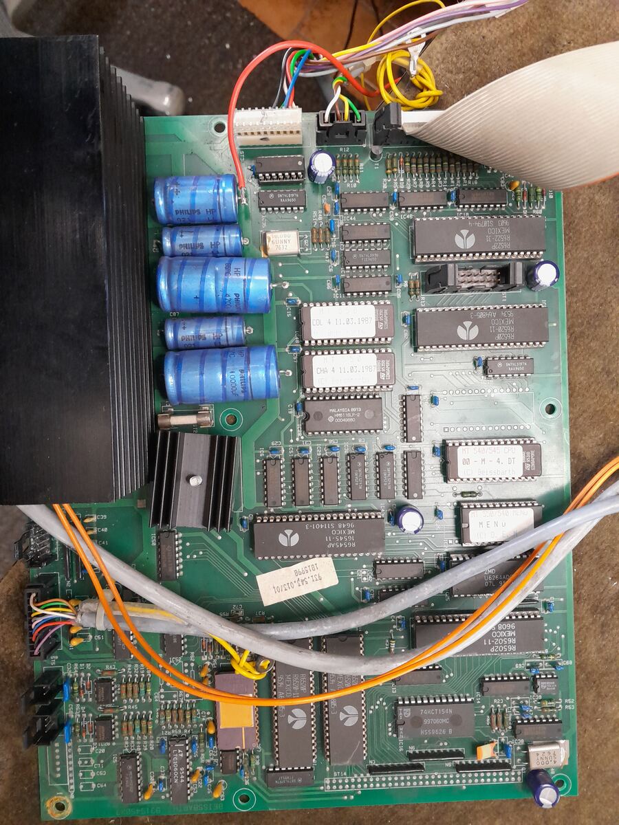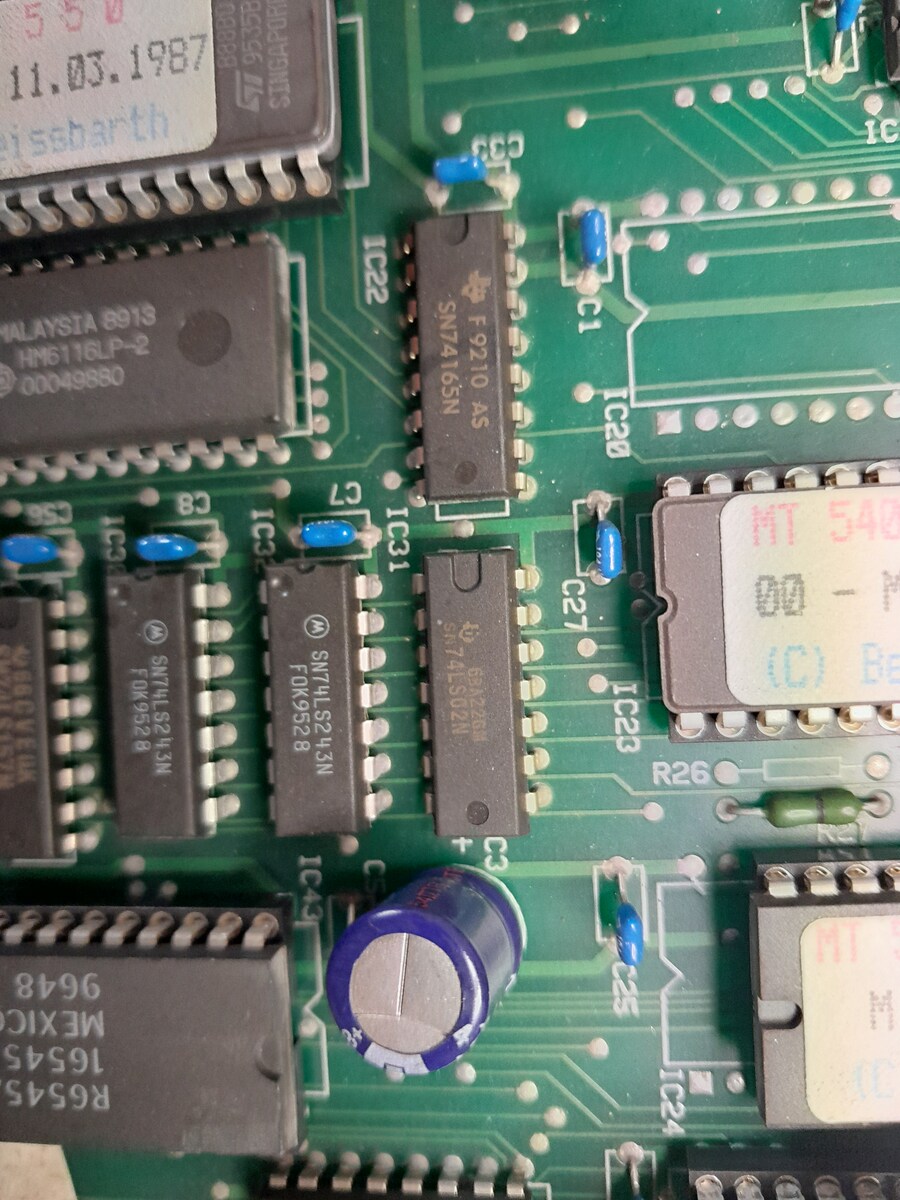 Viele Jahrzehnte alte Maschine, die im Betrieb vibriert? Alle gesockelten Bauteile und Verbinder vorsichtig ziehen und neu stecken. Alle Elkos prüfen: Statt auslöten und Kapazität/ESR zu messen, schlage ich Rippleprüfung mit Oszi vor. Behelfsmäßig geht auch die AC Ripplespannung mit DVM zu messen, wenn das DVM die Grund DC Spannung im AC Bereich verträgt. Wie wurde festgestellt, dass der Monitor nicht das Problem ist?