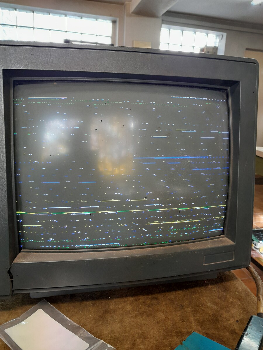 Das schlagfeste Gehäuse des Monitors ist links unten durchgebrochen, die Platine innen drin wird gebrochen sein - es fehlt die horizontale Synchronisation. Da aber die Pixel ordentlich und auch verschiedene Farben und Symbole zu sehen sind, arbeitet der eigentliche Computer. Der Fehler wird wahrscheinlich ausschliesslich im Monitor zu suchen sein, Leiterbahnen unterbrochen.