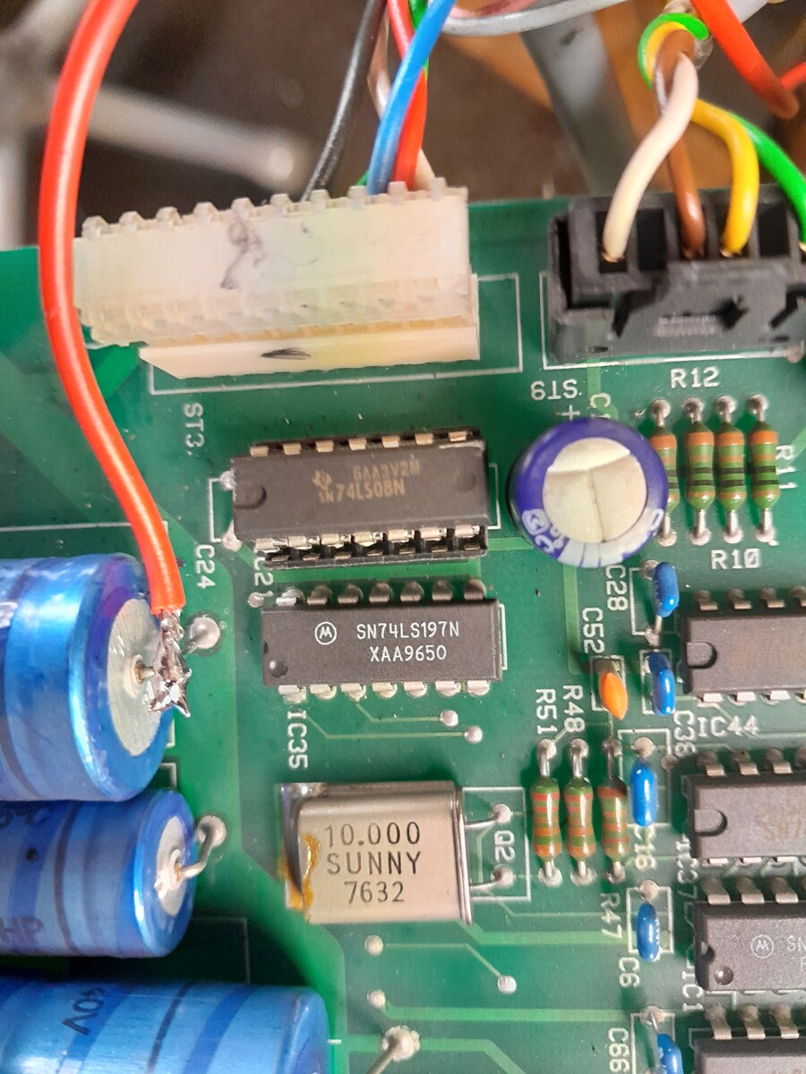 Hallo, Ich habe von einem guten Freund eine Reifen auswucht Maschine hier die kein Bild mehr bringt. Der Ausgang zum Monitor welcher okay ist erfolgt über rgb +hv über eine Ader. Kann jemand zu dem Fehlerbild im Anhang was sagen wo ich suchen sollte bzw tauschen kann. Das Ausgangs Ic und den Video Prozessor habe ich schon ohne Erfolg getauscht. Ich hoffe auf Hilfe und Unterstützung von Profis in dem Bereich.