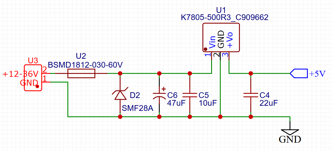 Falls euch das interessieren sollte: Die Aktuelle Spannungsregelung wird von dem von Harald empfohlenen (DANKE) Spannugnsregler dominiert und von ein paar Bauteile ergänzt. Kurz zu den Bauteilen: -D1 = 1N5819WS zur Absicherung gegen Verpolung -D2 = SMBJ36A zur Absicherung gegen Spannungsspitzen beim Ein oder Ausstecken des Netzteils -C5 = Laut Datenblatt zum Betrieb bei 24v empfohlen -C4 = Laut Datenblatt -C6 = Laut Datenblatt Sollte mit meinen Ergänzungen eine gut abgesicherte Quelle für 5V sein.