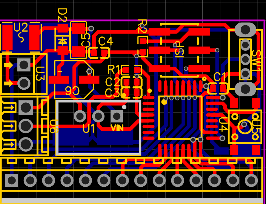 Wenn ich 019.PNG so sehe: Gönne Dir eine 4-Lagen Platine. Kostet heutzutage fast nichts mehr (insbesondere bei unter 100x100). Werden zwar einige herummaulen, dass das Verschwendung sei aber bei der Packungsdichte macht das schon Sinn. Obere Mittellage komplett GND, untere Mittellage komplett 5V. Siehe auch Bild, die GND-Führung ist gruselig.