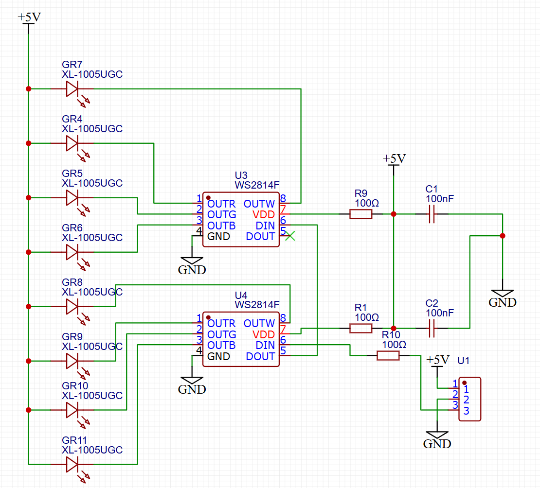 Rahul D. schrieb: > Die WS281x-Contrller brauchen per 100Ohm-Widerstand kaskadiert werden Komischer Satz - nix verstehen. Dergute W. schrieb: > im 001.png ist der Wurm drinnen Noch vorm ersten Kaffee? Hast du vergessen, wie Links funktionieren? ;-) Nico schrieb: > 001.png Die Beschaltung des DIN von U3 ist wahrlich schief gegangen. Der DOUT vom U4 kann nie gegen die 100Ω von R9 gegenan treiben. Mindestens überschreitet der Strom sämtliche Grenzwerte des DOUT vom U4. Und ja, VDD sollten beide irgendwie bekommen.