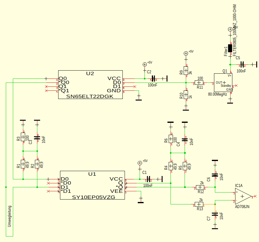 Hallo zusammen, wahrscheinlich bin ich in der falschen Ecke. Ich will mal die Bodenfeuchte messen. Aber nicht kapazitiv sondern über die Laufzeit. Ist nur so mal eine Bastelidee, denn so etwas kann man für mehr Geld auch kaufen. Ich brauche Hilfe bei der Anpassung (bzw. ist die richtig) z.B. R1, R2, R3 und C3. Ist PECL womit ich nicht wirklich bastle. Genauso R9, R10, R11. Den Ad708 hab ich mal symbolisch eingezeichnet, dort soll dann noch das entstandene PWM-Signal ausgewertet werden. (Also keinesfalls als Komparator) Der SN65ELT ist auch semioptimal, denn der läuft mit 5V.Für die Anpassung auf 3,3V muss ich mal nach etwas anderem schauen. Mit der Frequenz ist es auch so eine Sache über die man lange nachdenken müsste. Quarze (oder PLLs) gibt es bis x GHz. Die beiden IC's schaffen bis 3GHz - mein FR4 aber nicht! Hat hier schon jemand Erfahrungswerte? Über hilfreiche Antworten würde ich mich freuen. jens