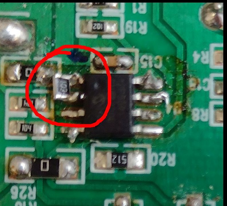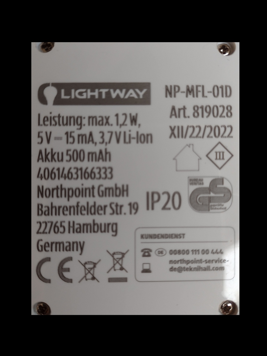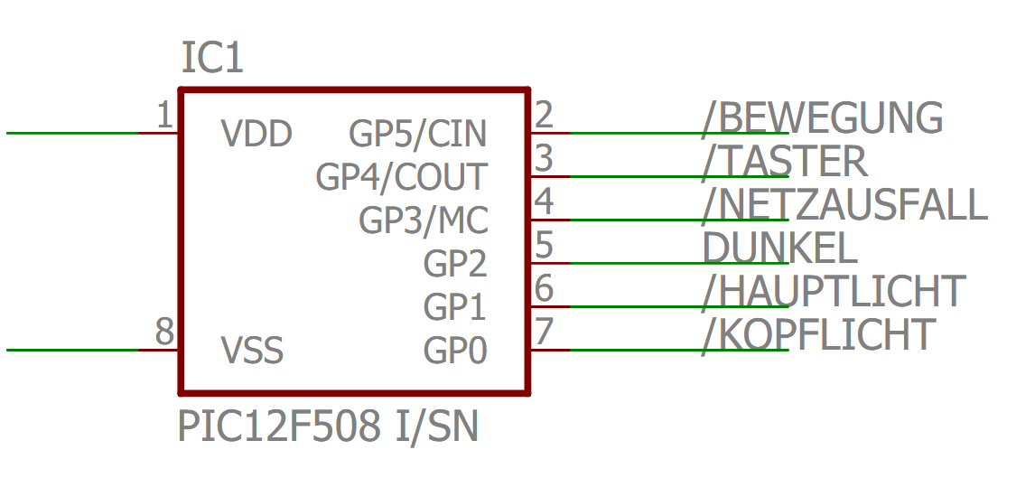 Lightway NP-NFL-01D ArtNr. 819028 XII/22/2022 Leistung : max. 1,2W 5V= 15 mA, 3,7 V Li-Ion Akku 500mAh EAN4061463166333 Northpoint GmbH Bahrenfelder Str. 19 22765 Hamburg Germany (siehe typeplate.jpg) Fehler: LED-Leuchte mit 2 LED-Modulen (Spot und Flood) reagiert auf gar nichts. Dieser Fehler war auch schon in diesem Beitrag beschrieben: Beitrag "Reparaturanleitung aufladbares LED Nachtlicht mit Taschenlampe und Notlichtfunktion" In unserem Repaircafe tauchen immer wieder mal Leuchten mit diesem Fehler auf. Der Vorschlag, den Akku kurzeitig abzuklemmen, hat den Fehler leider nie behoben. Die Überprüfung aller Komponenten ergab, das alles normal arbeitet, nur der im Bild pcb_original.jpg links markierte Baustein zeigte keine Reaktion. Der Baustein ist nicht bedruckt oder die Bedruckung ist entfernt. Da an Pin 1 die Versorgungsspannung von 3,6V und an Pin 8 GND anliegt, lag es nahe, den defekten Baustein durch einen PIC zu ersetzen. Anschlussbelegung siehe PinAssignment.png. Ich habe einen PIC 12F509 verwendet, für die aktuelle Software reicht aber auch ein 12F508. Der defekte Baustein kann 1:1 ersetzt werden, lediglich zwischen Pin1 und Pin2 ist ein externer pullup-Widerstand von 1k erforderlich, siehe pcb_modified.jpg. Vor Beginn der Arbeiten unbedingt den Akku abklemmen!!! Hex-file zur Programmierung: Nachtlicht.X.hex Quellcode: nachtlicht.c Die Software ist kein Versuch, das Originalverhalten nachzustellen. Mit dem Taster schaltet man das Licht zwischen den Zuständen flood, head und off um. Dafür den Taster 0.5 sec drücken. In der Ladeschale wird bei Erkennung von Dunkelheit und Bewegung das Licht entsprechend dem gewählten Zustand für 30s eingeschaltet. Jede Bewegungserkennung innerhalb dieser Zeit, setzt den Timer wieder auf 30s. Außerhalb der Ladeschale oder bei Netzausfall wird das Licht dauerhaft in den gewählten Zustand geschaltet.