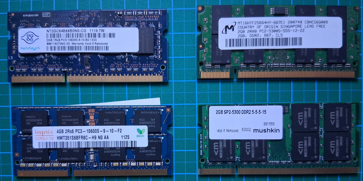 Hallo, ich verschenke 4 ältere RAM-Module gegen Portkosten (Kompaktbrief + Verpackung). Die Daten sind den beiden Fotos zu entnehmen, testen konnte ich die Teile nicht. Eine Garantie für die einwandfreie Funktion kann ich daher nicht übernehmen. Michael S.