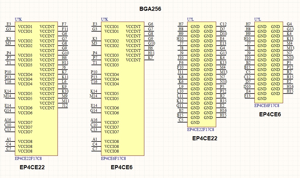 Ja auch das package Migrationskonzept, mit dem die Verkäufer gerne hausieren gehen, sollte mal praktisch hinterfragt werden. Anbei der Datenblattauszug für den Cyclone 4. (aus https://cdrdv2-public.intel.com/654630/cyiv-51001.pdf) Mir scheint die Spanne von 280 zu 343 IO's auch etwas "mutig", Normal sind bspw. bei Xilinx 3 benachtbarte Größenvarianten und ein paar Pins unterschied. So ne bekannte Strategie ist, für den Prototypen einen FPGA mit nehr ressourcen zu nehmen und für die Serie, Custom-derivate die kleineren. Das man mit Klein entwickelt und dann das PCB für "groß" wiederverwendet ist eher ungewöhnlich. Bedenken hätte ich bspw. beim Stromverbrauch, 8 mal mehr resourcen braucht 8 mal mehr Strom und dementsprechend dickere Kupfertracks. Für den reinen BGA-footstep mag die Kompabilität noch (Theoretisch) gelten, für das Gesamte PCB wohl eher nicht.
