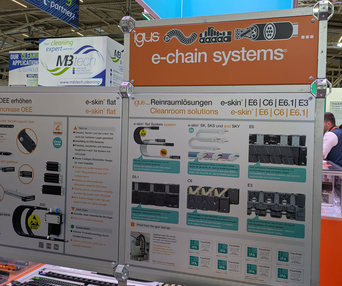 Roboter im Reinraum sind insofern unschön, als im Rahmen von Bewegungen entstehende “Abriebe“ - logischerweise - der Reinheit der Atmosphäre im Reinraum nicht sonderlich zulässt zuträglich sind. Der Kunststoffspezialist Igus bietet nun verschiedenste Kabelketten und Kunststoffkonstruktionen an, die für den Einsatz im Reinraum optimiert sind.