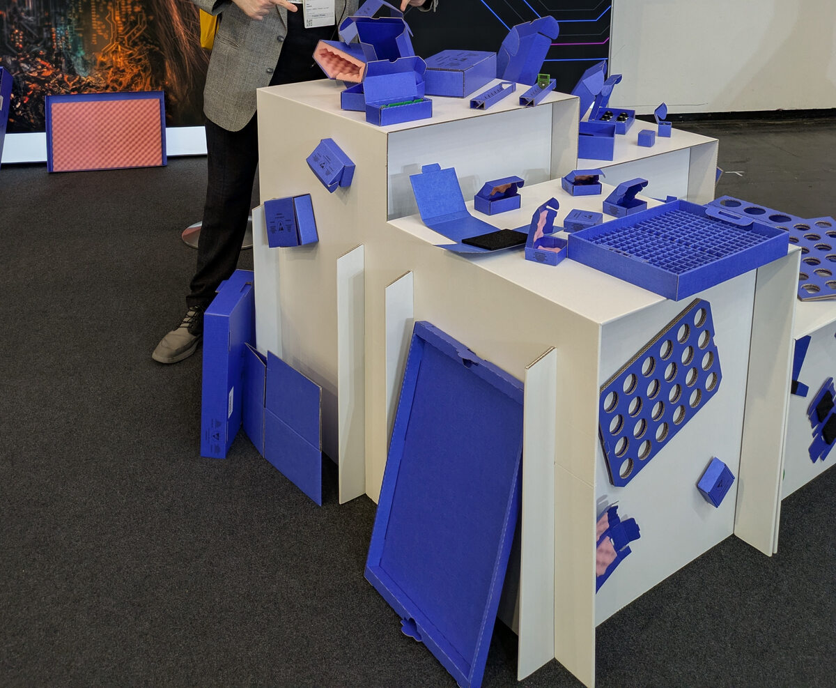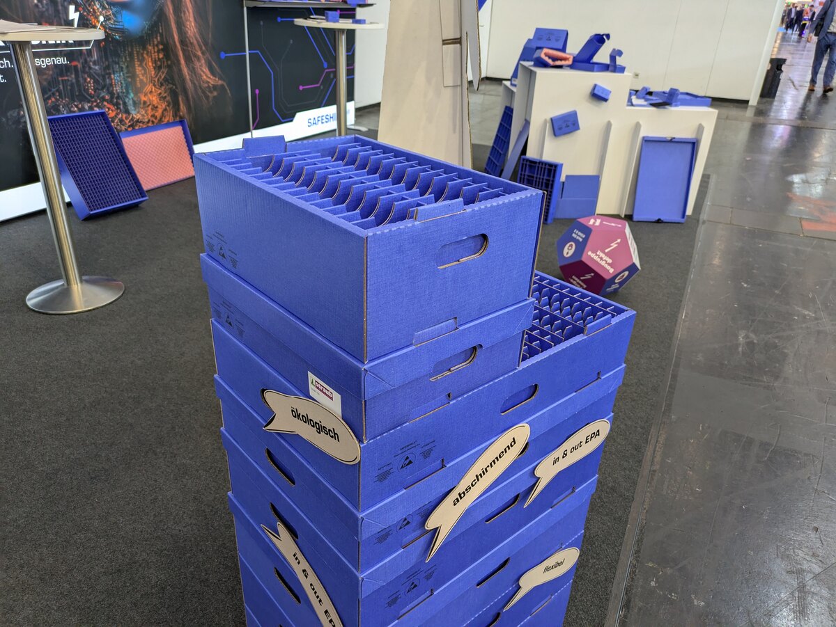 Die Reduktion der in Produkten enthaltenen Kohlenstoffmenge ist nicht nur beim Government Contracting hilfreich. Der Verpackungshersteller Straub Verpackungen - das Standpersonal bezeichnete sich selbst als „Verkäufer von Kartonverpackungen“ – führte vor einigen Jahren Experimente durch, um Wellpappe “ESD-abweisend“ zu gestalten. Lohn der Mühen war ein Produkt, das - wie in der Abbildung gezeigt - in verschiedensten Darbietungsformen verfügbar ist. Hervorzuheben ist außerdem, dass Kunden die Verpackungen, die ihr Lebensende erreicht haben, einfach über den Altpapier-Container zum Recycling werfen können.