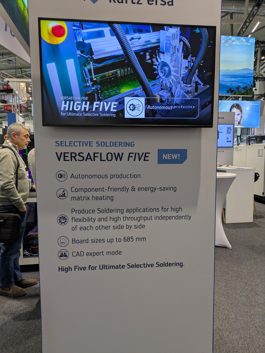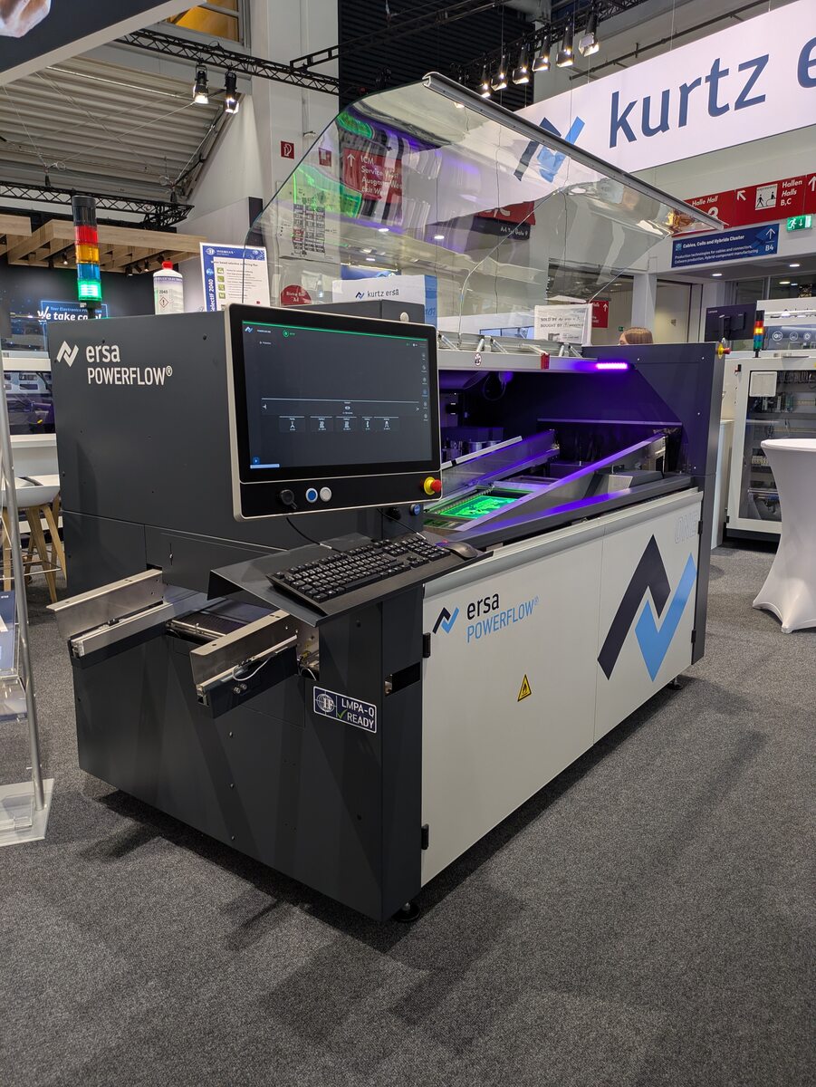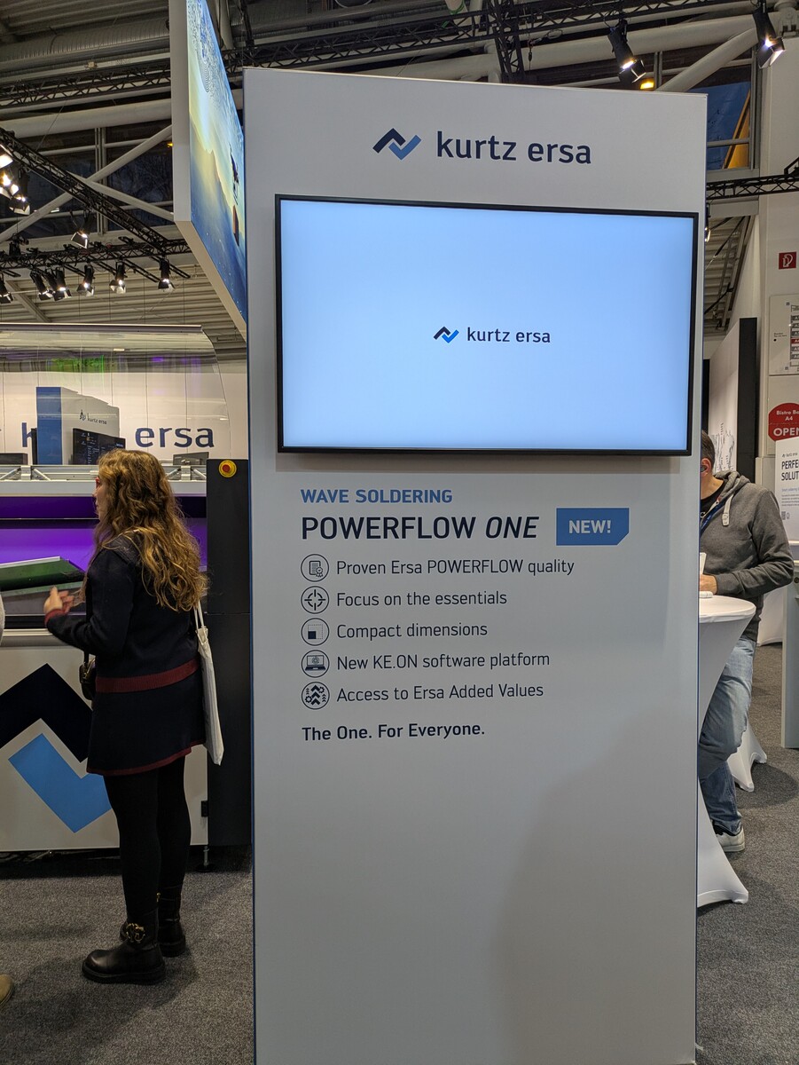 Obwohl der Siegeszug von Surface Mount-Komponenten nicht mehr nennenswert weg zu diskutieren ist, gilt, dass insbesondere schwere oder mechanisch beanspruchte Bauteile von der höheren Robustheit der Durchsteckmontage profitieren. Im Hause Kurtz Ersa bietet man verschiedenste Geräte an, um das Verlöten dieser Komponenten zu erleichtern. Neues Produkt Nummero eins ist die PowerFlow - eine „klassische“ Wellen-Lötanlage. Das Standpersonal betonte als Unique Sales Proposition vor allem die vergleichsweise kleine Größe des Systems.