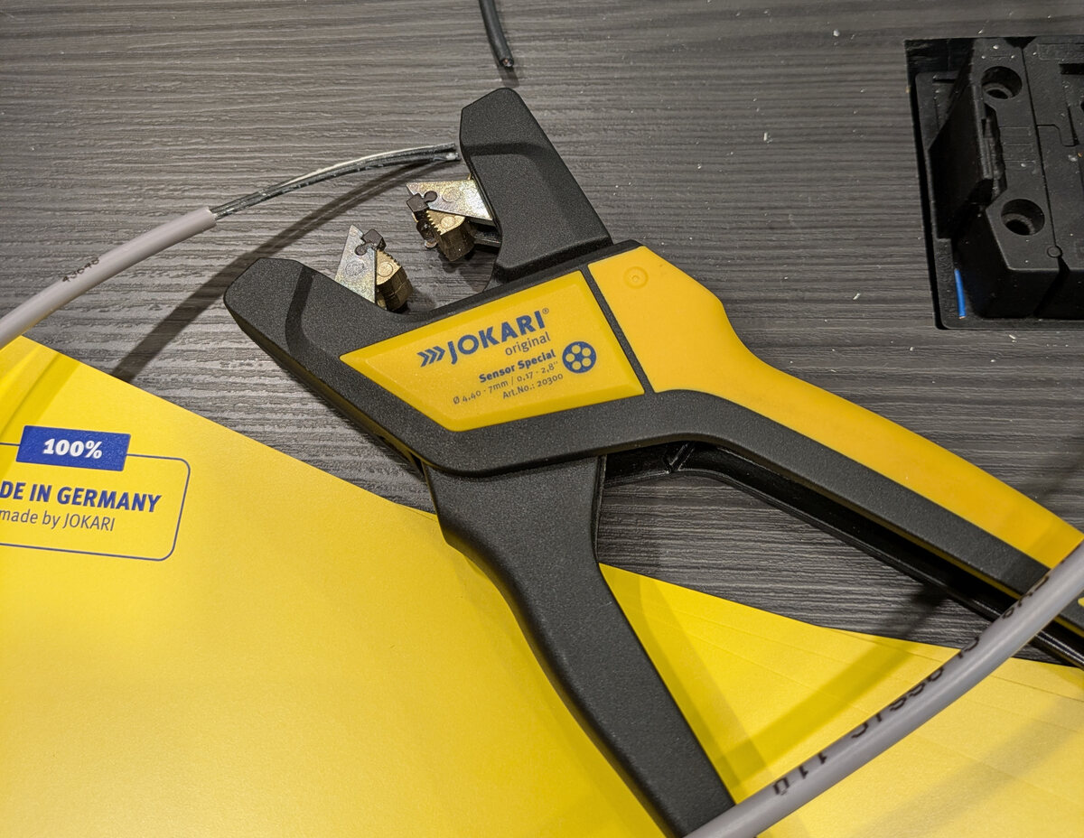 Im Hause Jokari gibt es - wie in der Abbildung gezeigt - eine neue Zange, die sich auf das Aufschneiden von Leitungen mit flexiblen Außenhüllen informiert.