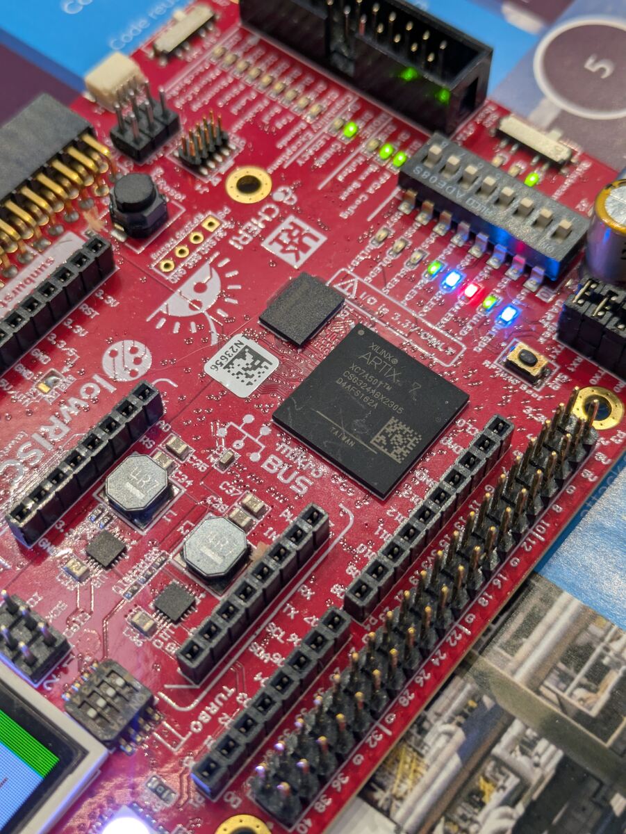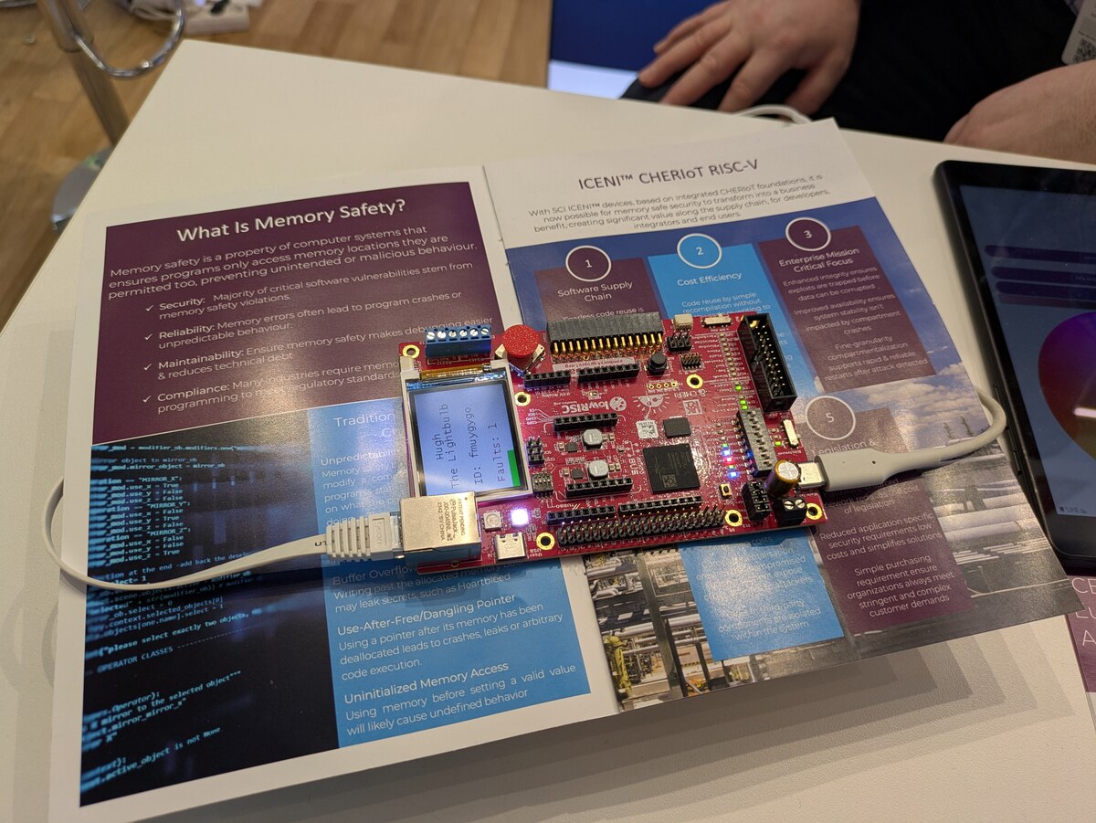 Das britische Unternehmen Cheriot möchte unter Nutzung von Rust einen Mikrocontroller realisieren, der für Speicherlecks unverwundbare Embedded-Systeme realisiert. Das Unternehmen war auch auf der Produktronica vertreten, und zeigt abermals ein auf einem FPGAs basierendes Demoboard. Aussage des Standpersonals war allerdings, dass erste Prototypen im Laufe der nächsten Woche eintreffen sollte.