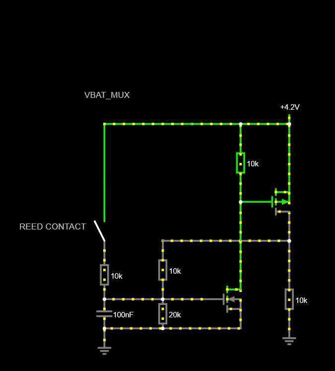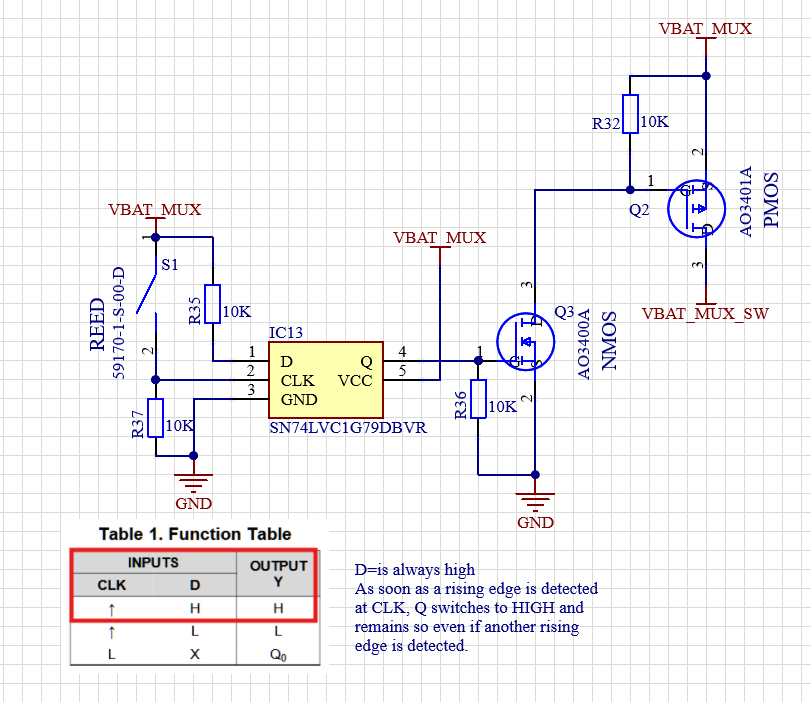Hi ich habe mir für ein (dienstliches) Projekt einen Schaltkreis ausgedacht (Initial main switch). siehe Anlage Was das für ein Projekt ist, kann/darf ich leider nicht sagen. Anbei die Schematic... Kleine Erklärung: Das Gerät wird durch 2 Batterien versorgt, eine ist ein Akku 3.7V 3000mAh (der über eine Solarzelle geladen wird) und einen Batterie Pack aus 9 Zellen ER14505) mit 3.6V und 24300mAh. Diese werden über einen PowerMuxer geregelt, je nach welcher die höhere Spannung hat und ist dann VBAT_MUX. Dieser hat ein Spannungsbereich von ~ 3.2V bis 4.2V Das Gerät hat keinen aus und ein Schalter und ist versiegelt. Also man kommt nicht an die Elektronik ran. Wenn die Batterien (in der Prodution) angeschlossen werden würde das Gerät sofort starten. Um die Spannungsversorgung erst beim Kunden zu aktivieren, habe ich mir folgenden initial main switch ausgedacht. Wenn der Reedkontakt durch einen Magneten geschlossen wird, entsteht am FlipFlop IC13 Pin 2 Clk eine Positive Flanke (vorher LOW PullDown), der Pin 1 D ist bereits auf High (PullUp), sodass Pin 3 Q auf HIGH gesetzt wird und den Q3 NMOS auf leitend stellt und den Q2 PMOS somit aktiviert. Erneutes betätigen des Reedkontaktes ändert dann nichts mehr. Die Spannung VBAT_MUX wird dann zu VBAT_MUX_SW an die LDOs (Screenshot) geschalten und bleibt dann immer an und soll auch immer an bleiben. Ich hoffe es ist verständlich und bitte um Euer Feedback?! Danke marco_m659
