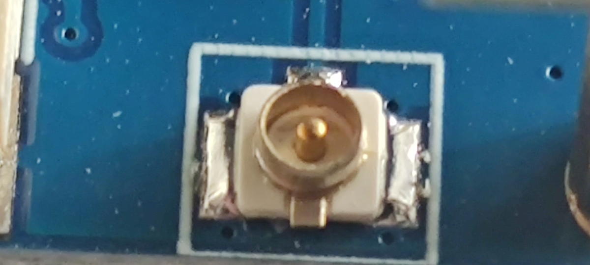 Das beantwortet deine Frage nicht direkt, aber ich würde in dem Fall die Buchse entlöten und eine eigene (z.B. SMA) anlöten. Es sieht aus als läge sie auf der Kante der Platine, es gibt SMA Buchsen die man seitlich auf die Platine schieben und dann verlöten kann.