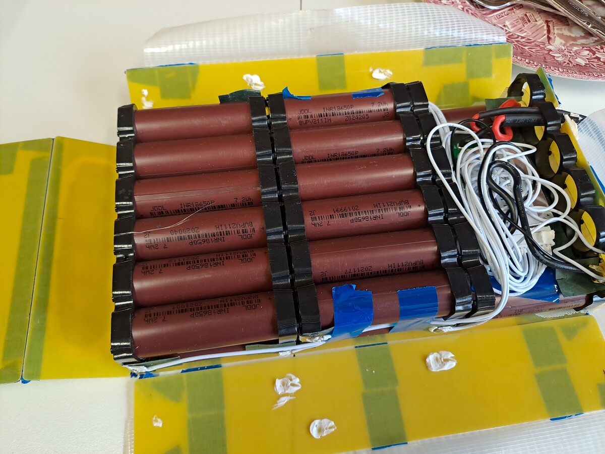 Oh Gott, ja! Danke! Es sind 30 Zellen! Aber es sind immer 3 parallel zusammengehängt. Daher 10x3,6V = 36V. 10S3P - jetzt verstehe ich diese Beschriftung. Der gezeigte Akku ist der Original-Akku. Ich habe ihn aufgemacht, weil ich dachte, ich könnte die defekten Zellen eruieren. Aber ohne entsprechende künstliche Last habe ich da keine Chance. Außen war er mit einem riesigen Schrumpfschlauch verpackt. Innen drinnen dann mit diesen Plastikplatten und Isolierband. Ich habe dann herausgefunden, dass es massig Ersatzakkus für diese Roller gibt. Ich wollte einfach einen Ersatzakku finden, weil auch von Reparaturen an LiPo-Akkus generell abgeraten wird.