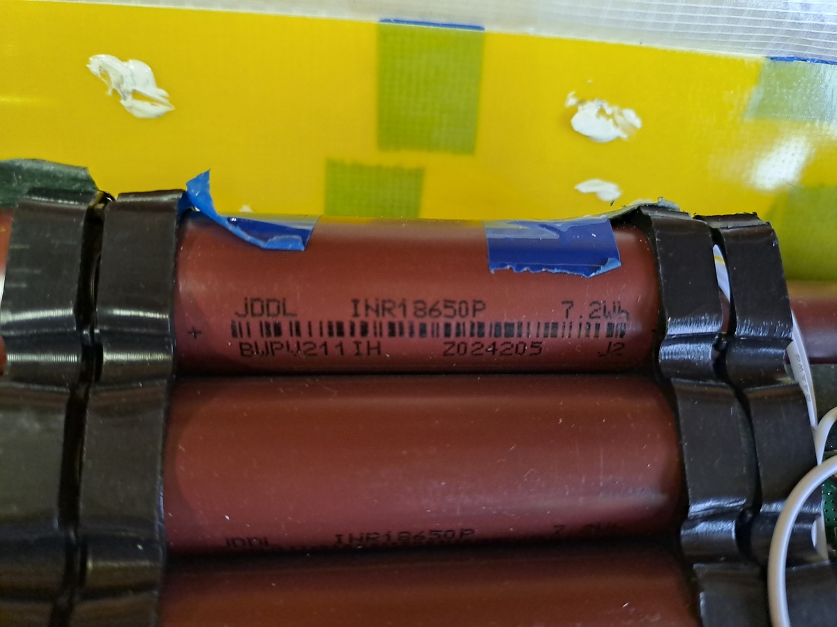 > Das Gehäuse ist ja aus FR4-Zuschnitten > und mit Klebeband zusammengehalten. Das ist einigermaßen normal, ist halt nur ein China-Bomber. Der weiße Kleber, der beim Einpacken die Balancer-Kabel halten soll, ist auch noch da. Das Klebeband ist aber wirklich verdächtig, normalerweise sind die Dinger eingeschlumpft, also kein echter Schrumpfschlauch, sondern diese komische Plastik-Folie, die sich bei Erwärmung zusammenzieht.