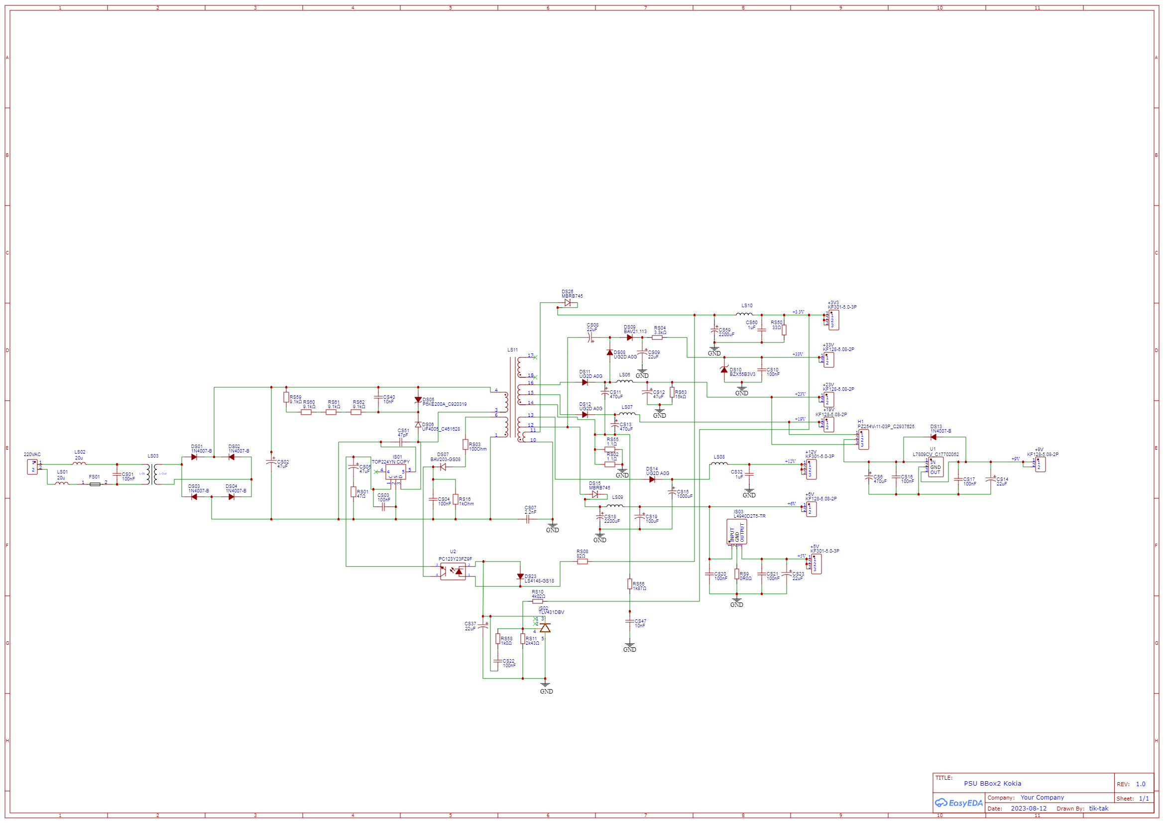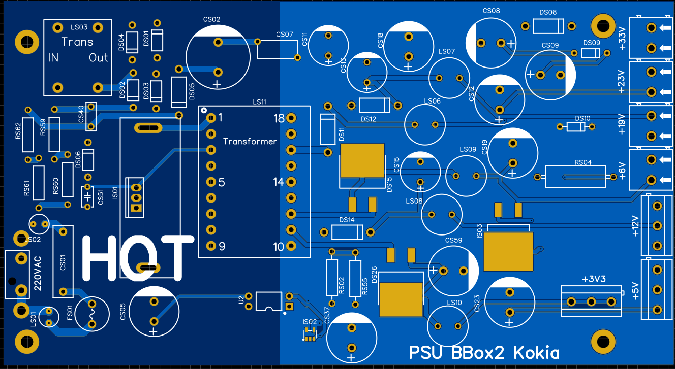 Hallo, Für meine Projekte brauche ich hin und wieder ein gutes Netzteil. Da ich noch einige Platinen der alten Dbox2 von Nokia übrig habe, habe ich den Schaltplan abgezeichnet und eine Platine davon angefertigt. Die Platinen werde ich demnächst bestellen und anschließend die Teile von der alten Platine ablöten und auf die neuen auflöten. Sobald es fertig ist, lade ich ein paar Fotos hoch. Als Ergebnis habe ich ein sehr gutes Netzteil. Netzteil liefert mir: +33V, +23V, +19V, +12V, +6V, +5V und +3,3V. Die +9VDC werde ich noch zufügen. Danke.