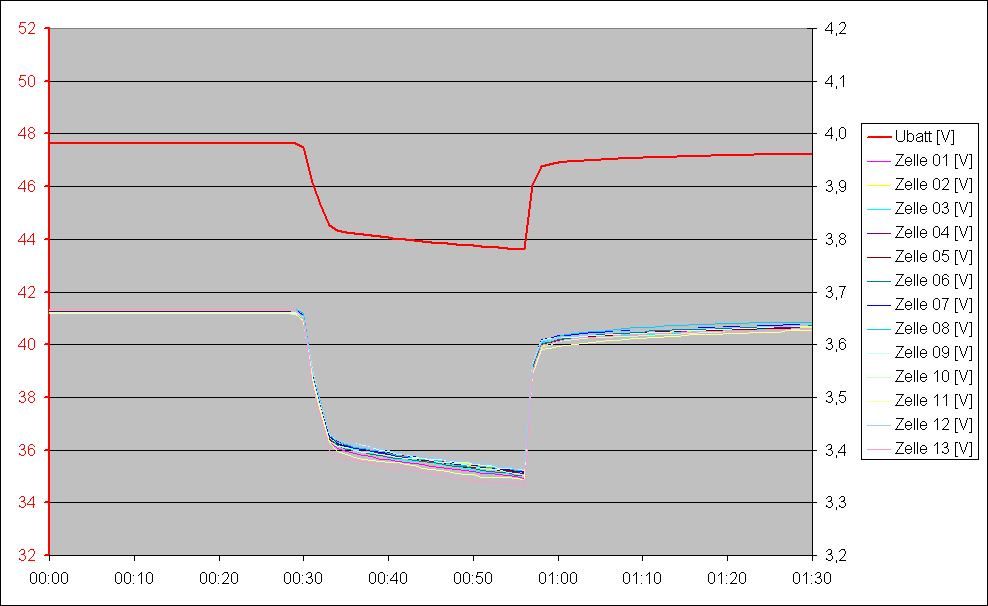 Gustav K. schrieb: > Will man wissen, wie weit die Alterung des Akkus fortgeschritten ist, > sollte man besser die Einzelspannungen unter Last messen. Gute Idee, Ergebnis oben. Die Gesamtspannung (rote Kurve) ist die Addition der 13 Einzelspannungen in EXCEL. Diese 14A Lastspitze werde ich ab jetzt jedes Jahr zum Saisonstart wiederholen. Trotzdem sind mir die Werte alle zu gut. Wenn ich es nicht selber gemessen hätte, würde ich es nicht glauben. Denn meine bisherigen Erfahrungen mit Lithium-Akkus bzgl. Langzeitstabilität sind eher schlecht. Zumal es sich um ein absolutes Billig-Bike aus dem Supermarkt handelt.